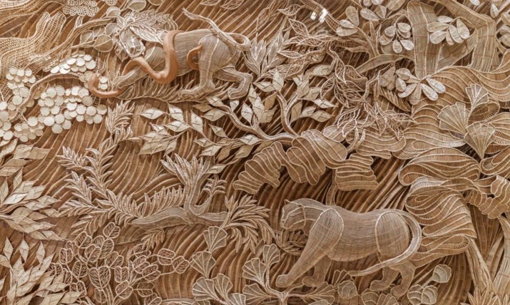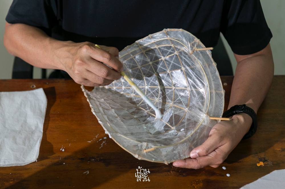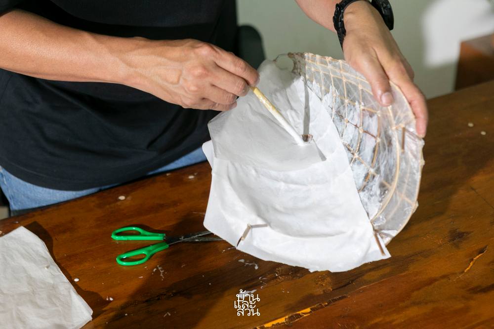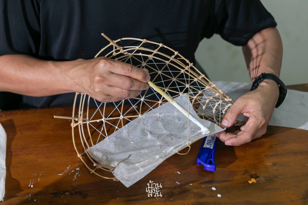 “ผมใช้ไม้ไผ่จากอำเภอบ้านลาดที่คุณลุงคุณป้าเหลาลบเหลี่ยมจนเป็นเส้นกลมสำหรับไว้ทำกระด้ง ยาวสักเมตรครึ่งเพื่อให้ขนขึ้นรถกระบะมาได้ ส่วนคนที่มาทำงานผูกงานมัดก็เป็นลูกหลานชาวประมงของบ้านแหลมที่เห็นพ่อแม่มัดผูกอวนมาตลอด และมาเรียนรู้การผูกไม้ไผ่จนชำนาญขึ้น เพราะคุณสมบัติของไผ่มีการดีดสปริงตัวได้ จึงต้องมีการดัดให้ฝืนธรรมชาติเพื่อจัดระเบียบใหม่ด้วยการขึ้นโมลด์ดัดเส้นไผ่ ใส่ความเป็นศิลปะเข้าไปจนเกิดเป็นรูปทรงโค้งอิสระตามที่ออกแบบไว้  แล้วผูกมัดด้วยเงื่อนแปที่เป็นเทคนิคการมัดโครงหลังคาเรือนผูกชาวเอเชียอาคเนย์ เราก็เอาภูมิปัญญานี้มาใช้ จากนั้นก็ถักเชือกทแยงมุมแบบว่าวสร้างลวดลายและทำให้โครงสร้างเข้ารูปเข้าทรง แล้วติดกระดาษสีขาวซึ่งเป็นกระดาษสาสำหรับไว้ขึ้นงานจิตรกรรมฝาผนังในวัดผสมกับผ้าขาวบางเพื่อทำให้ผิวตึงและทนทานก่อนทับซ้อนด้วยกระดาษอีกชั้น ใช้กาวทาเป็นตัวช่วยเสริม ก็จะได้ผิวที่เหนียวเหมือนผ้าแต่ให้สัมผัสเหมือนกระดาษที่นุ่มนวลและสวยงามมีเสน่ห์เฉพาะตัว”