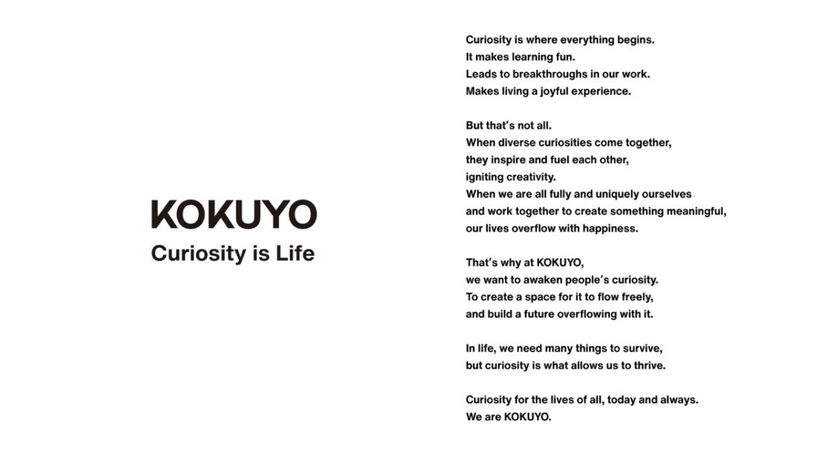 คาแรกเตอร์องค์กรใหม่นี้เป็นครั้งแรกในประวัติศาสตร์ของ KOKUYO ที่ได้กำหนดข้อความ (Corporate Message) เพื่อสื่อถึงจุดยืนของแบรนด์ในการสร้างแรงบันดาลใจให้กับผู้คนทั่วโลก “Cusriosity : ความอยากรู้อยากเห็น” คือจุดเริ่มต้นของการเรียนรู้ การทำงาน และการใช้ชีวิตที่มีความหมาย — และ KOKUYO มุ่งมั่นที่จะส่งต่อคุณค่านี้ให้กับทุกคนผ่านการออกแบบผลิตภัณฑ์และประสบการณ์ที่หลากหลาย