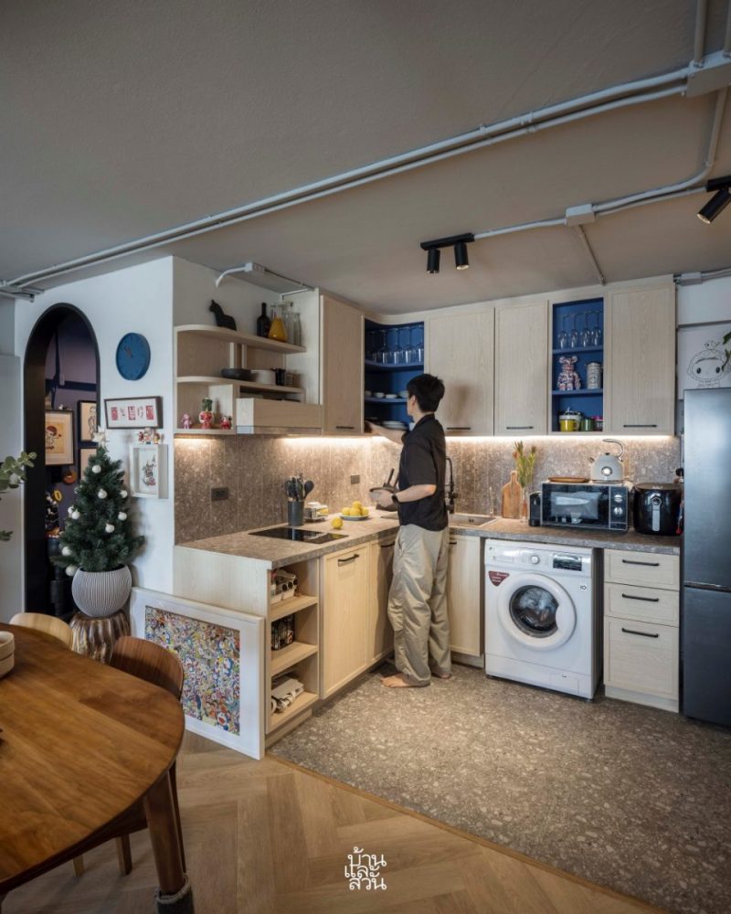 คอนโดเก่ารีโนเวตใหม่ โดยห้องเดิมมีสภาพโทรมมากเหมือนในหนังผี เพื่อสร้างครัวสไตล์คันทรีที่เคยฝันไว้ ซึ่งเป็นมุมที่ใช้เวลาด้วยมากที่สุด พร้อมตกแต่งด้วยของเก่า ของมือสอง โดยมี “เตาอบคุณปู่” เป็นของรักของหวง >> อ่านต่อ
