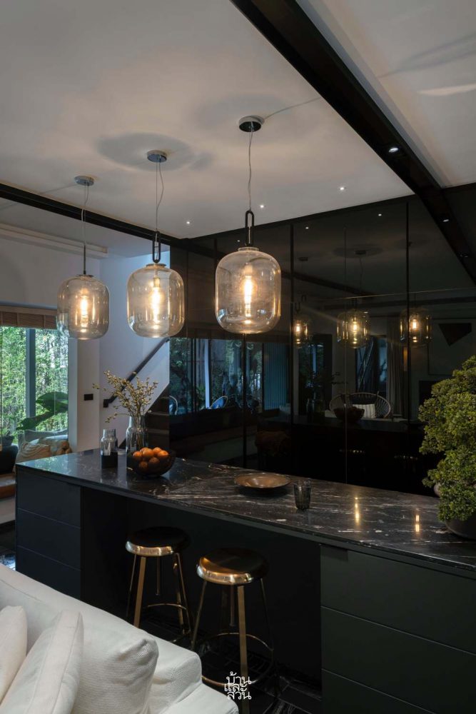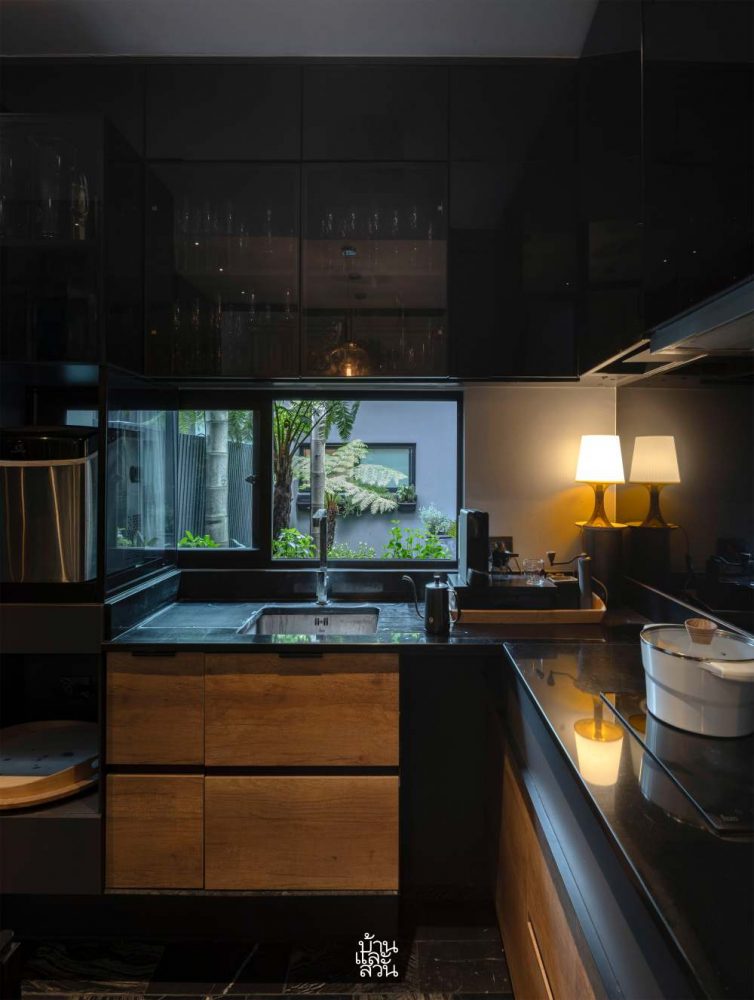 นอกจากนี้ ยังมีการเพิ่มโทนสีดำจากตู้บิลท์อินสำหรับเก็บของ ตู้ซ่อนงานระบบ และตู้ใช้งานในครัวเล็กซึ่งเน้นใช้วัสดุกระจกติดฟิล์มสีดำ เพราะต้องการให้ตู้ดูกลืนหายไปกับผนังแต่ขณะเดียวความเงาของกระจกก็ยังพอสะท้อนพื้นผิวให้มีมิติที่ไม่แบบราบจนเกินไป