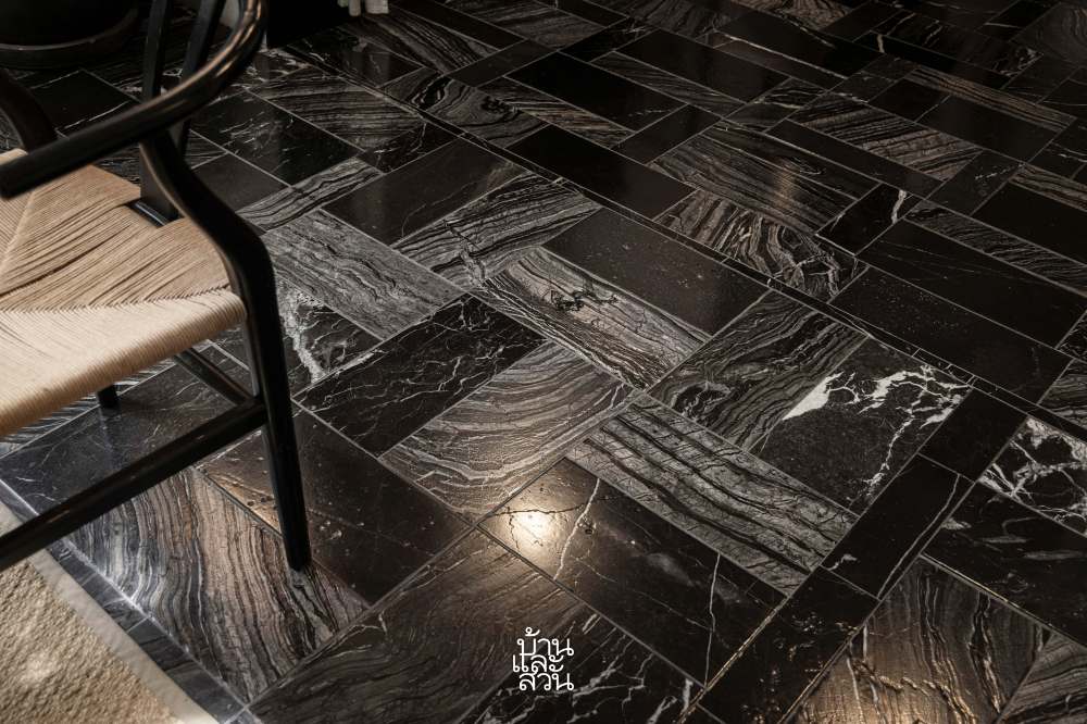 เทคนิคสำคัญอย่างหนึ่งที่เจ้าของบ้านนำมาใช้สร้างบรรยากาศภายในบ้านให้ดูผ่อนคลายและสบายตาขึ้นคือเรื่องของโทนสี ซึ่งช่วยลดความจ้าของผนังสีขาวเดิมลง ด้วยการเปลี่ยนวัสดุปูพื้นกระเบื้องเดิมทั้งหมดเป็นหินอ่อนในโทนสีดำ