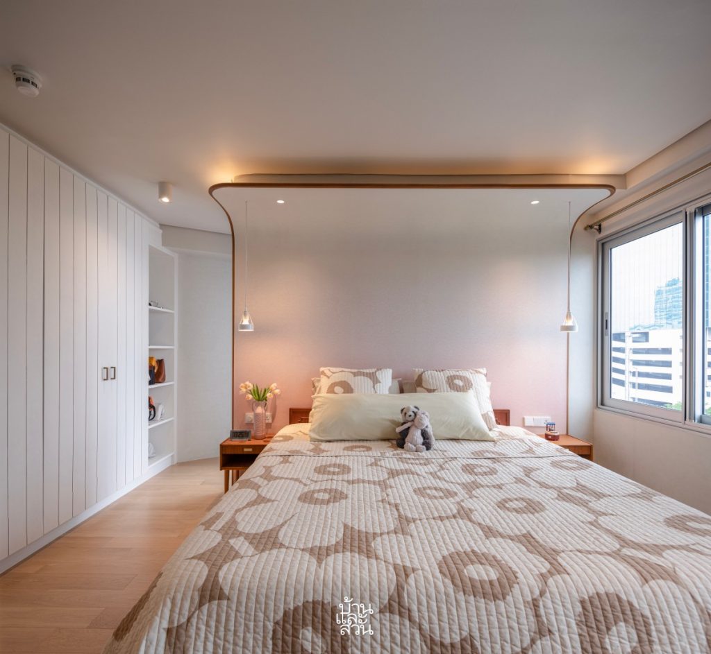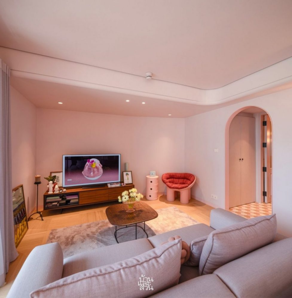 ห้องขนาด 90 ตารางเมตร ไม่ได้เป็นรูปทรงสี่เหลี่ยมสมมาตร แต่มีส่วนของผนังเอียงตามรูปทรงของอาคารกลายเป็นโจทย์ท้าทายอีกข้อหนึ่งของการรีโนเวตห้องนี้ โดยคุณเจ-ภูเมศร์ เตชะบรรเจิด เจ้าของห้องและมัณฑนากรแห่ง huippu แก้ปัญหาด้วยการออกแบบผนังโค้งเพื่อให้เชื่อมต่อกับผนังอื่น ๆ ทำให้บ้านดูมีลูกเล่นไม่เรียบหรือดูแฟชั่นจนเกินไป และใช้วิธีออกแบบตู้เก็บของมาช่วยบังความเฉียงของผนัง เพื่อลดความรู้สึกของการอยู่ในห้องที่ไม่ใช่รูปทรงสี่เหลี่ยม ซึ่งก็ทำให้ได้พื้นที่เก็บของเพิ่มขึ้นในอีกหลาย ๆ มุม แล้วยังเลือกใช้โทนสีชมพูมาตกแต่งห้องได้อย่างละมุนละไม ไม่ฉูดฉาด จะผสมให้สวยลงตัวอย่างกลมกลืนยังไง คลิกอ่านต่อกันเลย