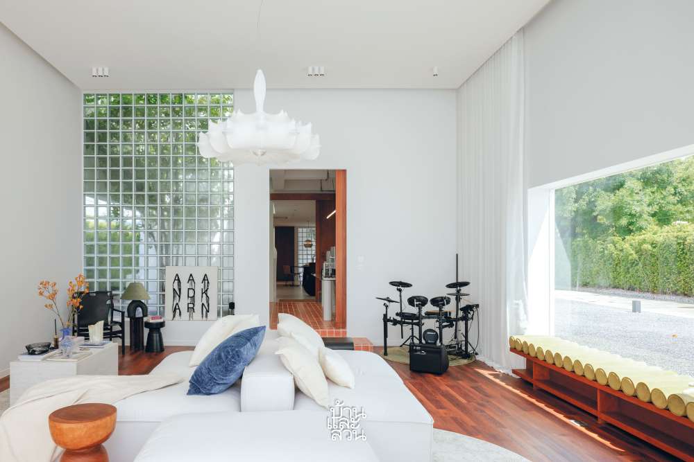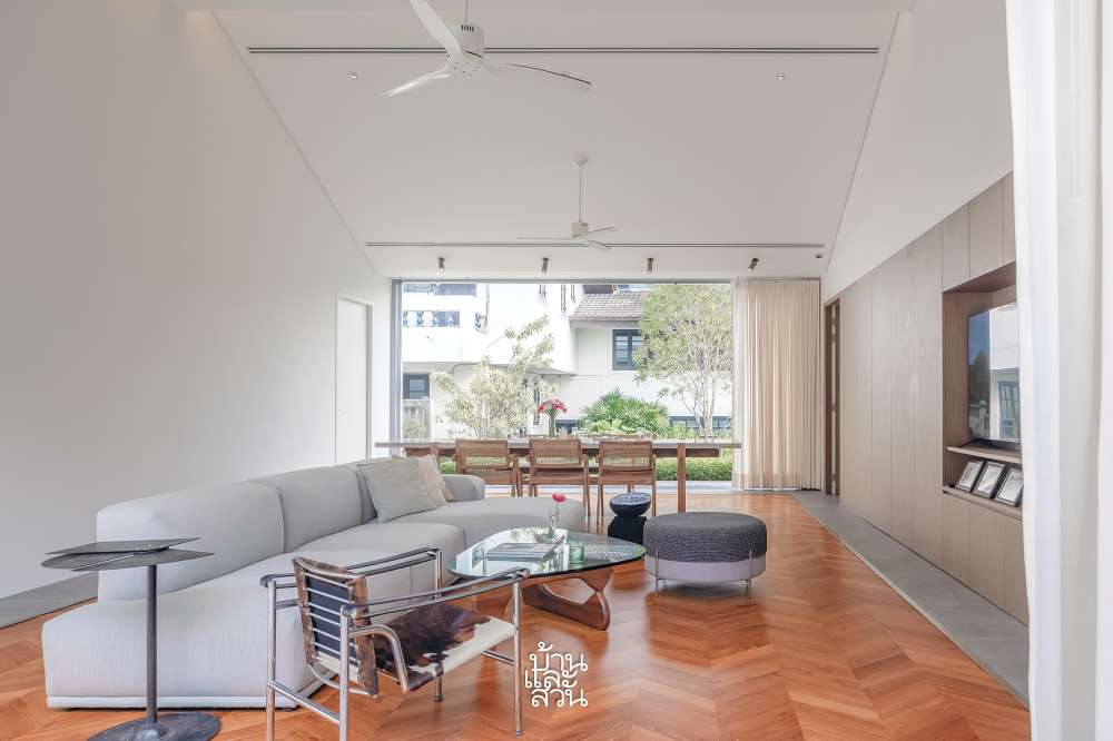 นั่งเล่นไม่พึ่งแอร์ในบ้านมินิมัลชั้นเดียว