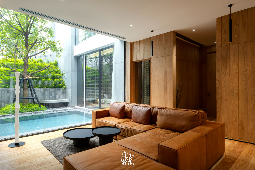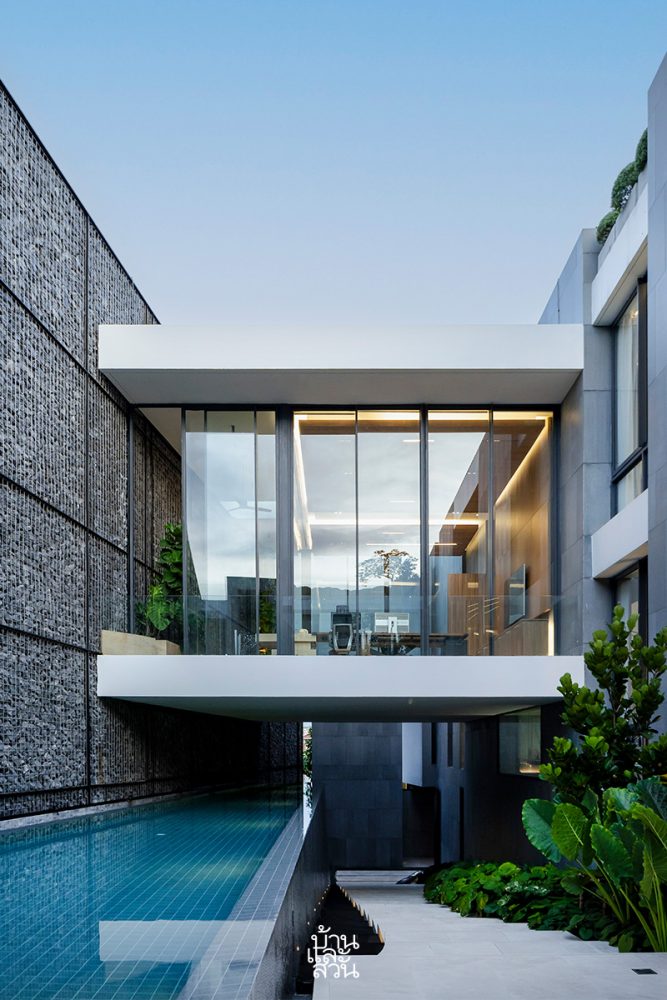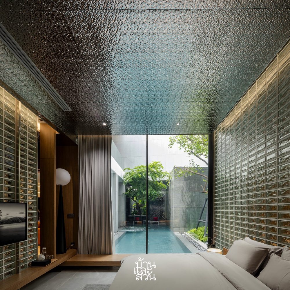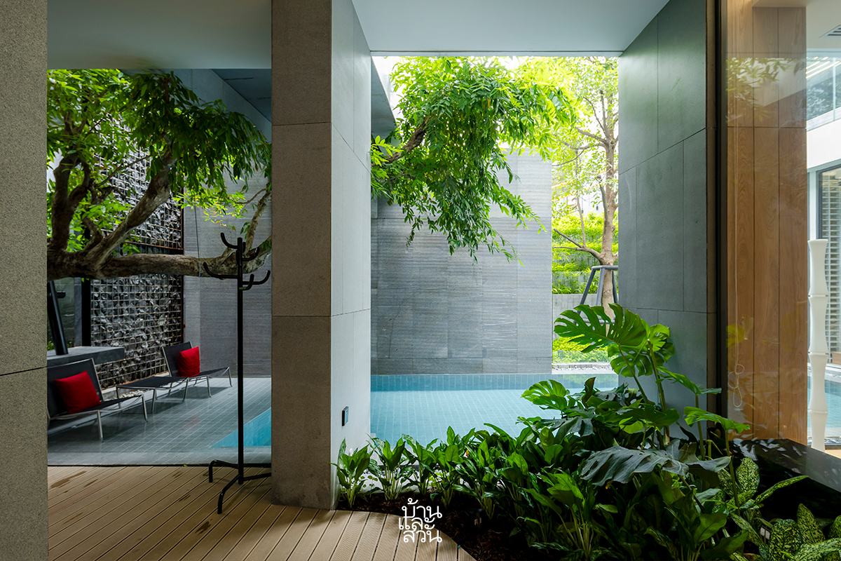 “รวมทั้งบริเวณคอร์ตกลางบ้าน จัดวางสวนและพื้นที่สีเขียวแบบ Pocket Park ในทุกพื้นที่ว่าง สร้างความเคลื่อนไหวด้วยสระว่ายน้ำรูปทรงแคบยาวล้อไปไปกับรูปทรงบ้าน โดยเปิดเพดานให้สูงโปร่ง รับลมและแสงสว่าง เสมือนการนำผืนฟ้าและแผ่นดินให้ลงมาเจอกันภายในบ้านหลังนี้”