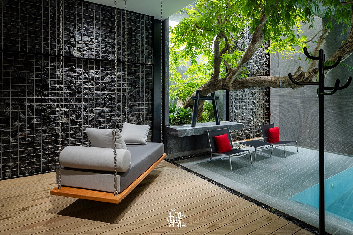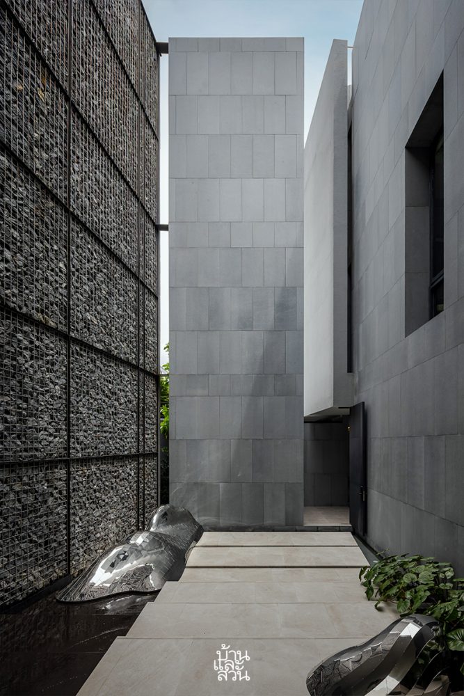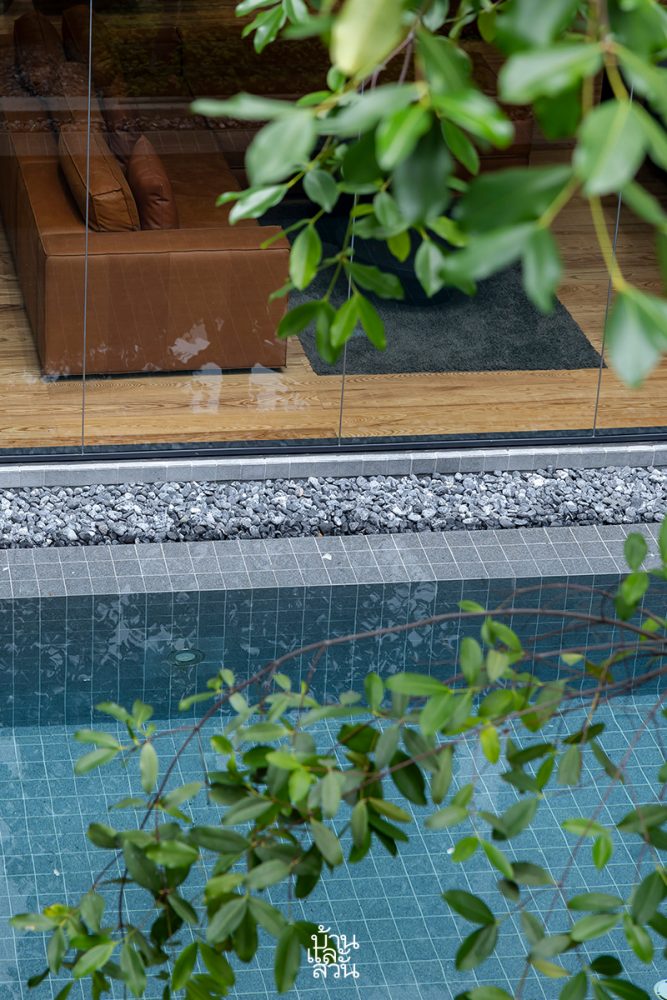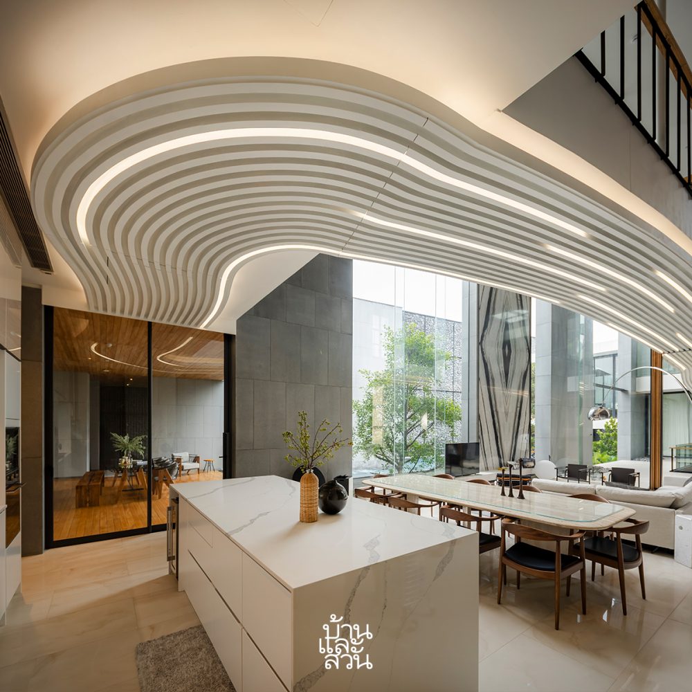 “รวมทั้งบริเวณคอร์ตกลางบ้าน จัดวางสวนและพื้นที่สีเขียวแบบ Pocket Park ในทุกพื้นที่ว่าง สร้างความเคลื่อนไหวด้วยสระว่ายน้ำรูปทรงแคบยาวล้อไปไปกับรูปทรงบ้าน โดยเปิดเพดานให้สูงโปร่ง รับลมและแสงสว่าง เสมือนการนำผืนฟ้าและแผ่นดินให้ลงมาเจอกันภายในบ้านหลังนี้”
