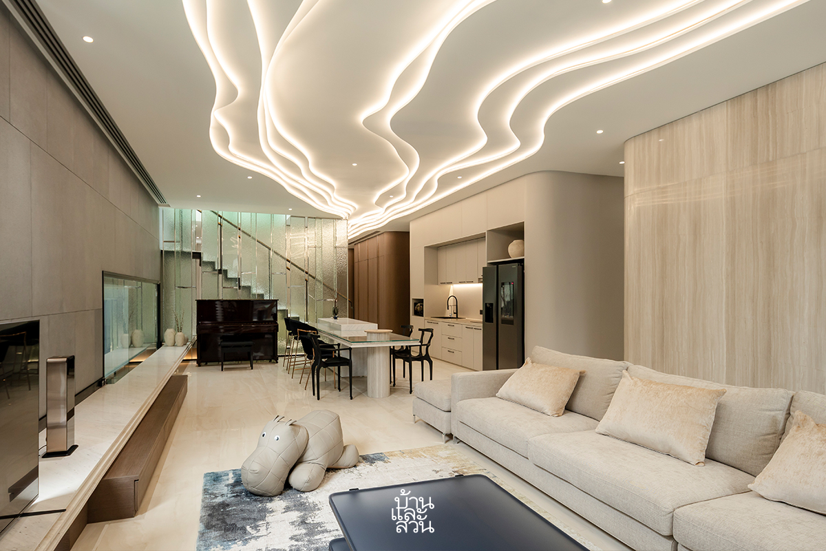 ในโซนนี้ มีไฮไลท์คือส่วนผนังตกแต่งด้วยแผ่นหิน Bookmatch Marble ขนาดใหญ่เพิ่มความโอ่โถง เมื่อมองขึ้นไปด้านบนจะเป็นฝ้าตกแต่งอยู่ใต้ทางเดินของพื้นที่ชั้นบนสร้างบรรยากาศ ในเชิงของฟังก์ชัน ได้จัดวางเฟอร์นิเจอร์ให้กระจายตัว มีทั้งโซฟา โต๊ะกลาง และเก้าอี้ที่ให้ผู้มาเยือนสามารถเลือกนั่งได้หลายแบบ ติดกันเป็นโต๊ะรับประทานอาหาร และครัวแพนทรี่ เพื่อรองรับการปาร์ตี้โดยเฉพาะ ทั้งหมดเชื่อมกันเป็นโถงแบบ Open Plan เพื่อความโปร่งโล่ง