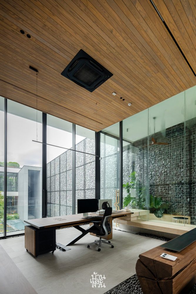 จากจุดนี้ ออกแบบให้สามารถมองเห็นส่วนอื่นๆ ภายในบริเวณบ้านได้โดยรอบ ไม่ว่าจะเป็น ห้องรับแขก สระว่ายน้ำ และ Pocket Park พื้นที่สีเขียวที่แทรกตัวอยู่ทั่วบริเวณ สร้างความสดชื่นและบรรยากาศเย็นสบาย ส่วนประตูห้องทำงานสามารถเปิดประตูได้ทั้งสองฝั่ง เพื่อสร้างการไหลเวียนอากาศที่ดี และมีพื้นที่ระเบียงเอาต์ดอร์สำหรับเปลี่ยนบรรยากาศระหว่างทำงาน