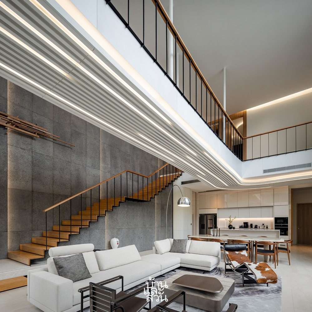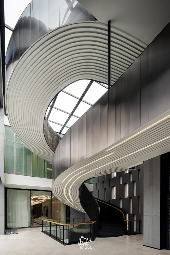 คุณเอกภาพ ดวงแก้ว จาก EKAR Architects ผู้ดูแลการตกแต่งภายใน เล่าให้ฟังถึงแนวคิดในการออกแบบว่า ได้แรงบันดาลใจจากเจ้าของบ้านซึ่งเป็นช่างภาพที่เดินทางทั่วโลก จึงต้องการให้ทุกมุมของบ้านเป็นเหมือนการเดินทางเข้าไปสู่ที่ใหม่ๆ ทั่วโลกอยู่เสมอ โดยยังคงยึดโยงกับโจทย์หลักของบ้านที่มีความผสมผสานระหว่างแผ่นดินและผืนฟ้า อาทิ การดีไซน์บันไดวนรูปโค้ง ให้เป็นเหมือนประติมากรรมกึ่งสถาปัตยกรรม (Architectural Sculpture) ที่มีรูปทรงเหลื่อมกันไปมา และติดตั้งช่องแสงด้านบนให้มองเห็นท้องฟ้า เพื่อให้นำพาความรู้สึกของผู้ใช้งานให้เหมือนกำลังเดินขึ้นไปจนถึงท้องฟ้า