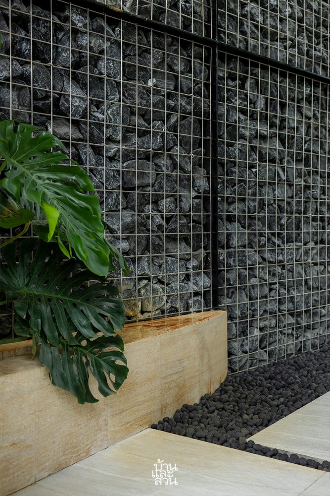 “โดย ฝั่งบ้านที่ต้องการความเป็นส่วนตัว จะใช้วิธีการเรียงหินเป็นกำแพงบังสายตาแบบทึบตัน แต่ในขณะเดียวกัน ถ้าสังเกตฝั่งด้านทิศตะวันตก จะเรียงหินให้มีช่องว่าง ให้มีสเปซ เพื่อให้ลมพัดผ่านเข้ามาได้ รวมไปถึงเวลากลางคืน เราอยากให้ตัวบ้านมีความเรืองแสง หรือในช่วงเย็นที่มีแสงธรรมชาติ แสงจากดวงอาทิตย์ที่กำลังจะตกสาดลอดเข้ามา ทำให้เกิดมิติของธรรมชาติเข้ามาในบ้านด้วย”