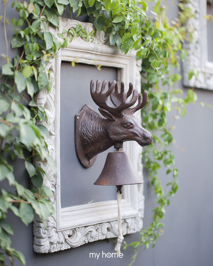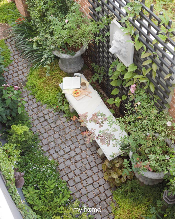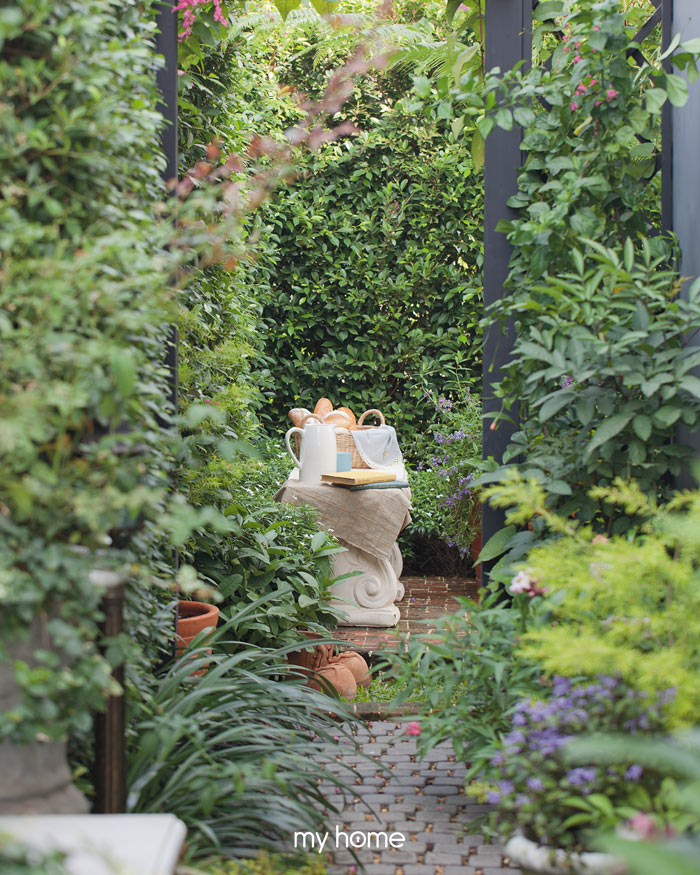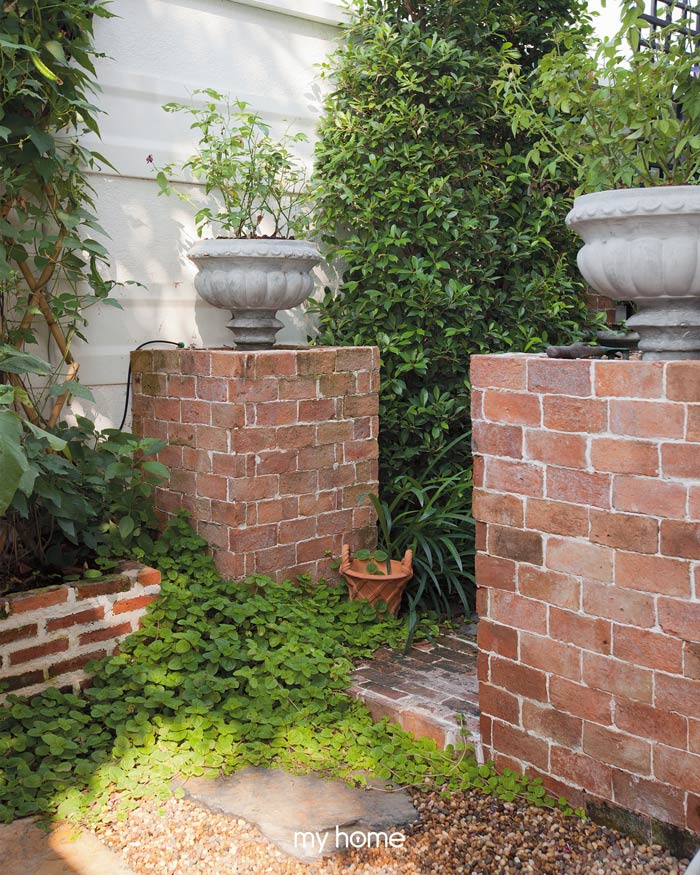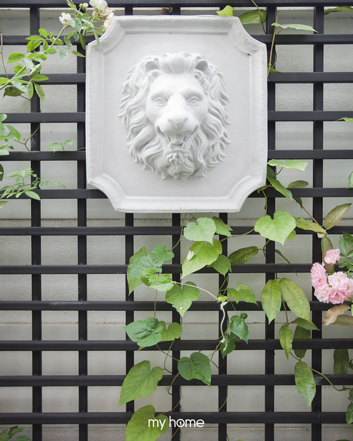 “ฝั่งตรงข้ามทาผนังโทนสีเทาประดับด้วยกรอบรูปลายวินเทจสีขาว สร้างเรื่องราว และ กลิ่นอายความเป็นสวนคลาสสิก ส่วนทางเดินปูแผ่นคาร์เพ็ตสโตนเป็นแนวตรง และโรยกรวด สุดเขตสวนมีหัวเสาเป็นสัญลักษณ์บ่งบอกว่า กำลังเข้าสู่โซนปลูกผักแต่ยังคงความรู้สึกถึงความต่อเนื่องกัน ก่อกระบะอิฐมอญเป็นรูปตัวแอลเข้ามุมฉากพอดีกับแนวกำแพงเพื่อประหยัดพื้นที่ใช้สอย ให้เจ้าของบ้านปลูกผักสวนครัวได้ตามความชอบ ส่วนพื้นวางแผ่นหินฟรีฟอร์มโรยกรวดแกลบเม็ดเล็ก ช่วยแก้ปัญหาดินกระเด็นเลอะผนังบ้านเวลารดน้ำได้ด้วย ” คุณศักดิ์ เล่าถึงการตีโจทย์ และออกแบบให้กับสวนแห่งนี้