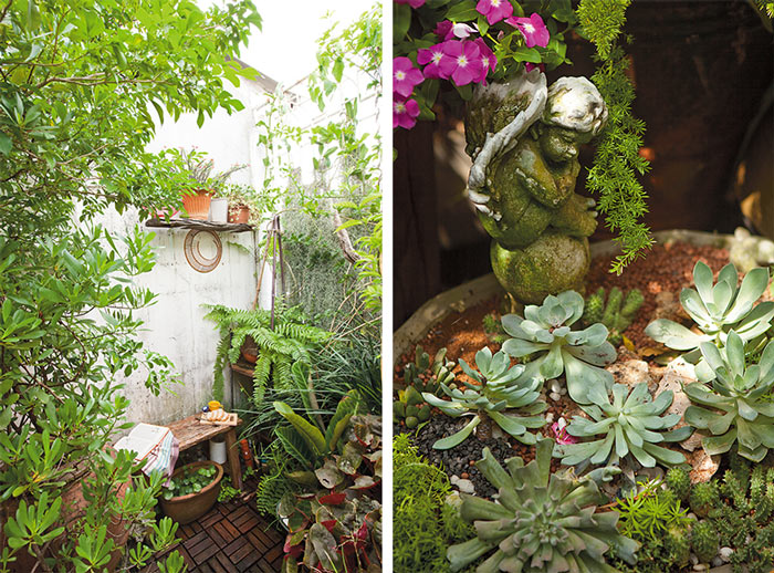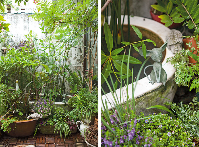 “ เดิมทีตรงนี้เป็นระเบียงธรรมดาว่าง ๆ มองออกไปยิ่งดูแห้งแล้ง แถมยังต้องเจอกับไอร้อนที่สะท้อนเข้ามายิ่งทำให้มุมนี้ไม่ค่อยได้ใช้งาน ถ้าปล่อยทิ้งไว้ยังไงก็คงไม่ได้ออกมาใช้ จะปล่อยให้เป็นพื้นที่ว่างก็ดูจะเสียประโยชน์ เลยคิดว่าถ้าอย่างนั้นทำเป็นสวนอาบน้ำกลางแจ้งเลยแล้วกัน เป็นการบังคับตัวเองให้ออกมาใช้งานด้วย แต่พักหลังมานี่ยุ่งมากเลยเปลี่ยนแนวมาเป็นมุมสวนนั่งเล่นเล็กๆ แทน บางครั้งก็พาอามิ (น้องหมา) ออกมาวิ่งเล่น”