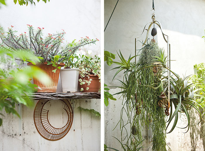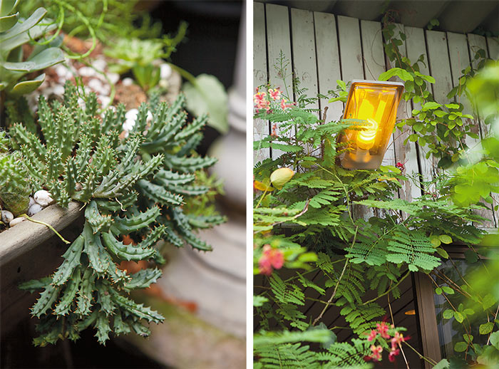” พรรณไม้ที่เลือกใช้จัดสวนค่อนข้างไปทาง สวนเมืองร้อน เพราะอยากได้บรรยากาศที่ร่มรื่น จัดวางในคอนเซ็ปต์เลียนแบบธรรมชาติผสม มีขนาดทรงพุ่มสูง กลาง ต่ำ ลดหลั่นกันไป ผมมักจะได้เห็นต้นไม้เติบโตในรูปทรงที่ประหลาด สีของใบที่เปลี่ยนไปจากเดิม หรือไม่ก็มีเมล็ดพันธุ์แปลก ๆ โผล่ขึ้นมาจากดินในกระถาง สำหรับผมนี่คือเสน่ห์และความมหัศจรรย์ของธรรมชาติ ” คุณแม็ค กล่าวไว้อย่างน่าฟัง