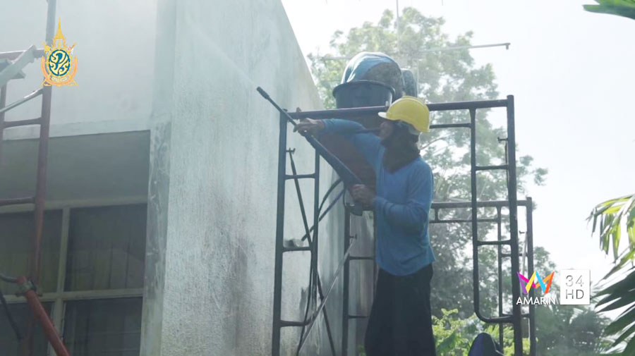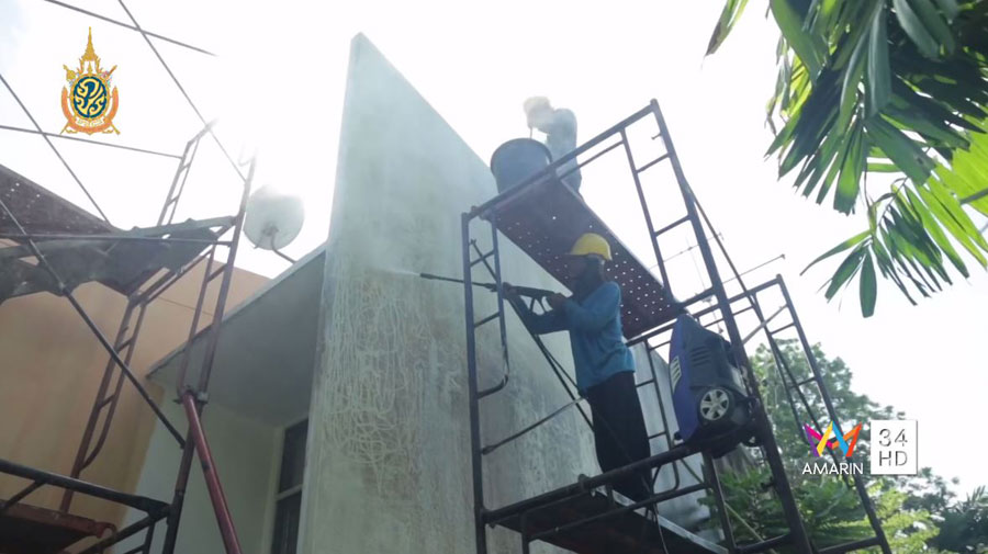 ขั้นที่1 ใช้น้ำแรงดันสูงทำความสะอาดผนังเก่าฉีดชะล้างสีเก่าและคราบรอยต่างๆให้เกลี้ยงเกลาจนเห็นรอยแตกรอยร้าวชัดเจน