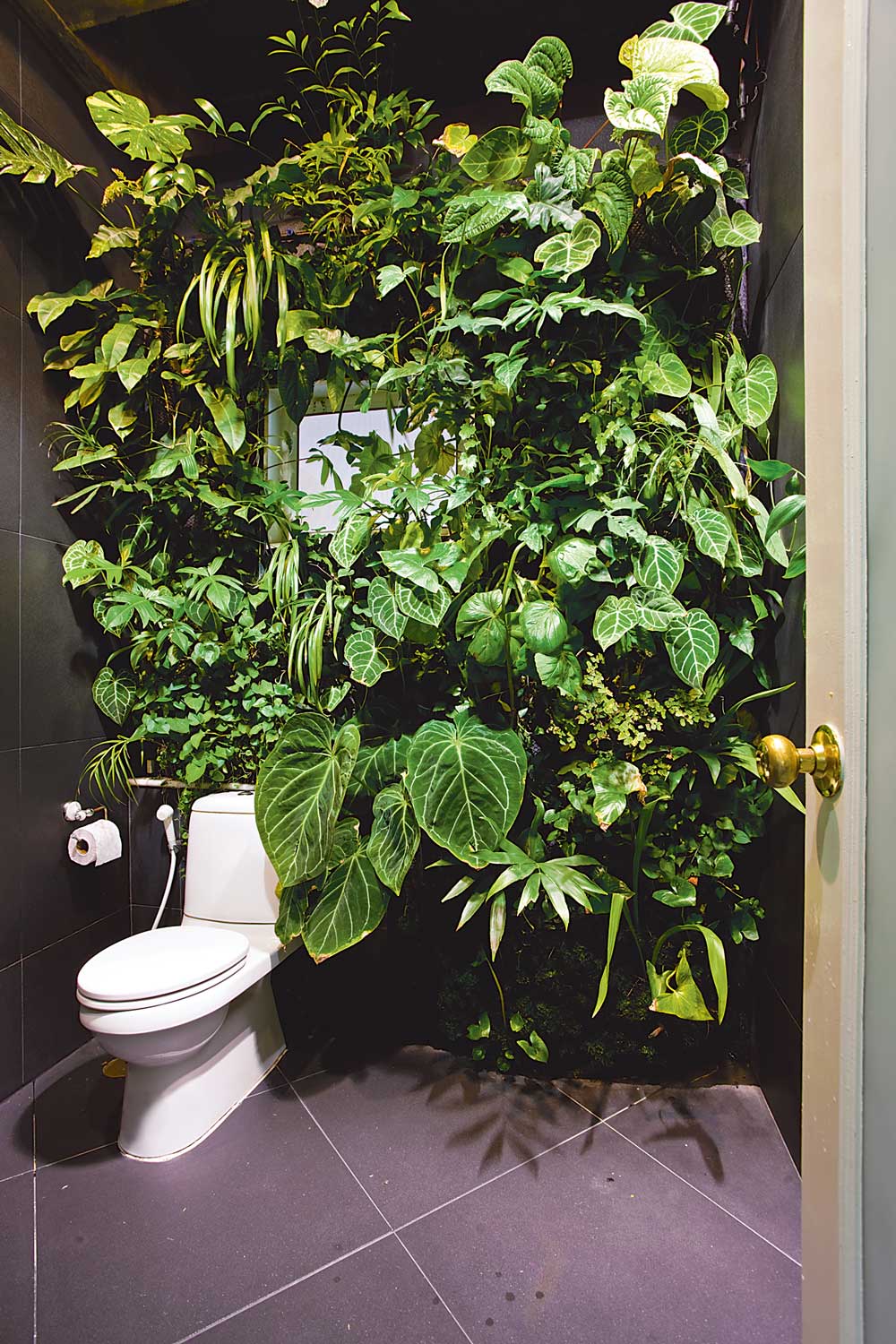 ส่วนอีกผนังที่มาทำทีหลังคือ สวนแนวตั้งในห้องน้ำขนาด 2 x 2.60 เมตร เป็นผนังที่ทำไว้เพื่อทดลองดูว่าหากปลูกพรรณไม้บนผนังในพื้นที่ร่มโดยให้แสงสว่างทดแทนแสงแดดอย่างสม่ำเสมอ ต้นไม้จะสามารถอยู่ได้หรือไม่ ซึ่งขณะนี้ผ่านไปประมาณ 7 เดือน ภาพรวมของผนังแนวตั้งและต้นไม้หลักๆก็ยังดูดีอยู่
