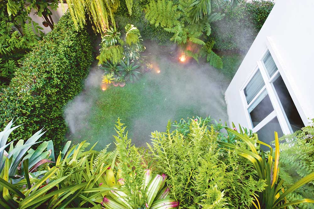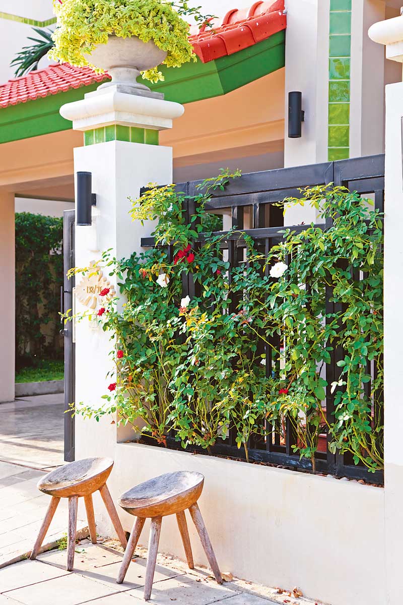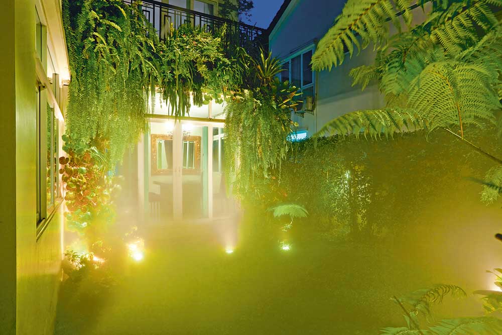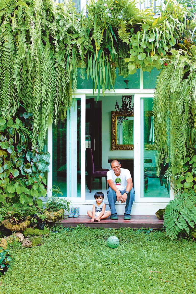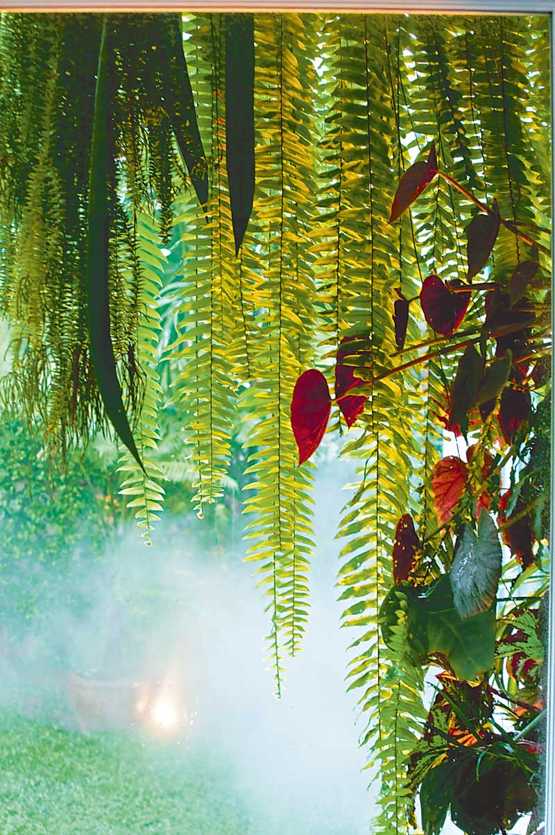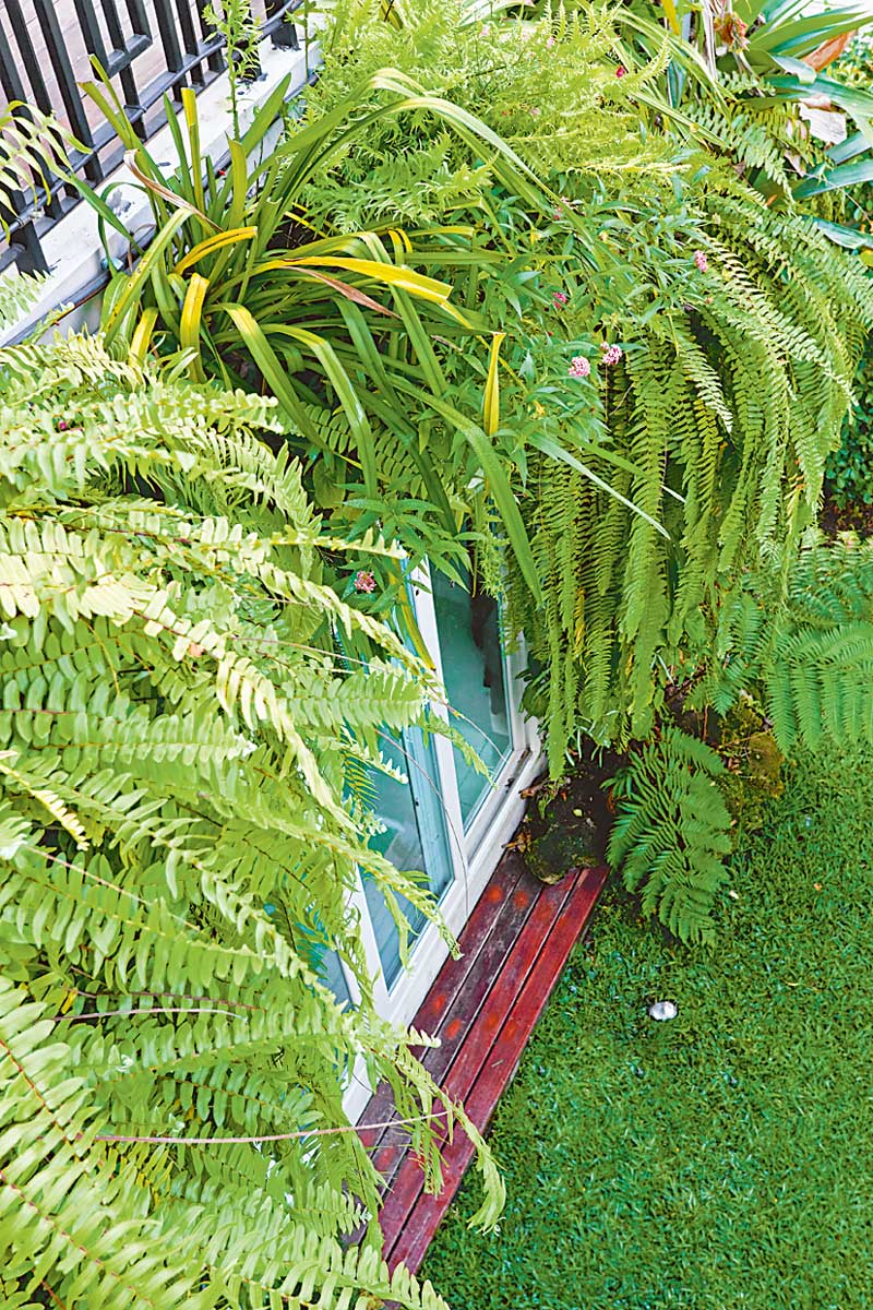 ด้านหลังซึ่งเป็นพื้นที่ส่วนตัว ออกแบบสวนแนวตั้งเป็นซุ้มม่านต้นไม้รอบกรอบประตูเนื่องจากบริเวณนี้ได้แสงแดดช่วงเช้า การเลือกพรรณไม้ส่วนใหญ่จึงเป็นพวก เฟินบริพัตร หน้าวัวใบพันธุ์เน็คไท ซึ่งมีใบยาวทิ้ตัวลงคล้ายม่าน ส่วนบางบริเวณที่อยากเพิ่มสีสันก็ปลูก บีโกเนีย แซมสลับให้มีเท็กซ์เจอร์แตกต่างกันบ้าง มีบางต้นที่ทดลองเปลี่ยนบ้างอย่าง ชมพูนุท ซึ่งเป็นไม้พุ่มหรือ ท้อลิลี่ ไม้ต้น ซึ่งจะมีช่วงพักตัวและช่วงสวย ก็ปล่อยให้เป็นไปตามฤดูกาล