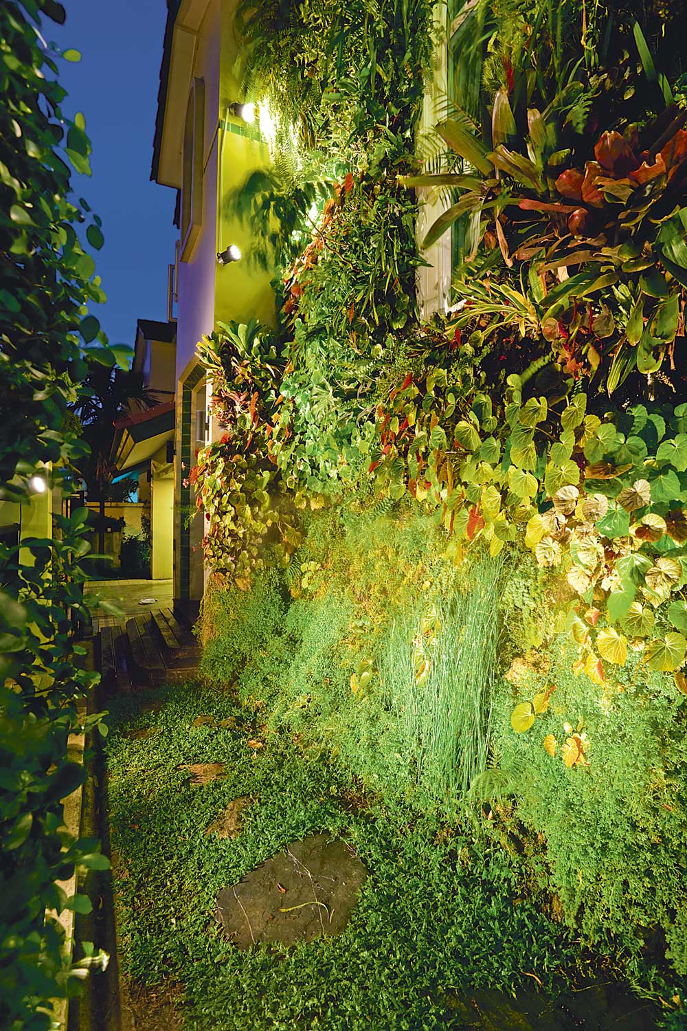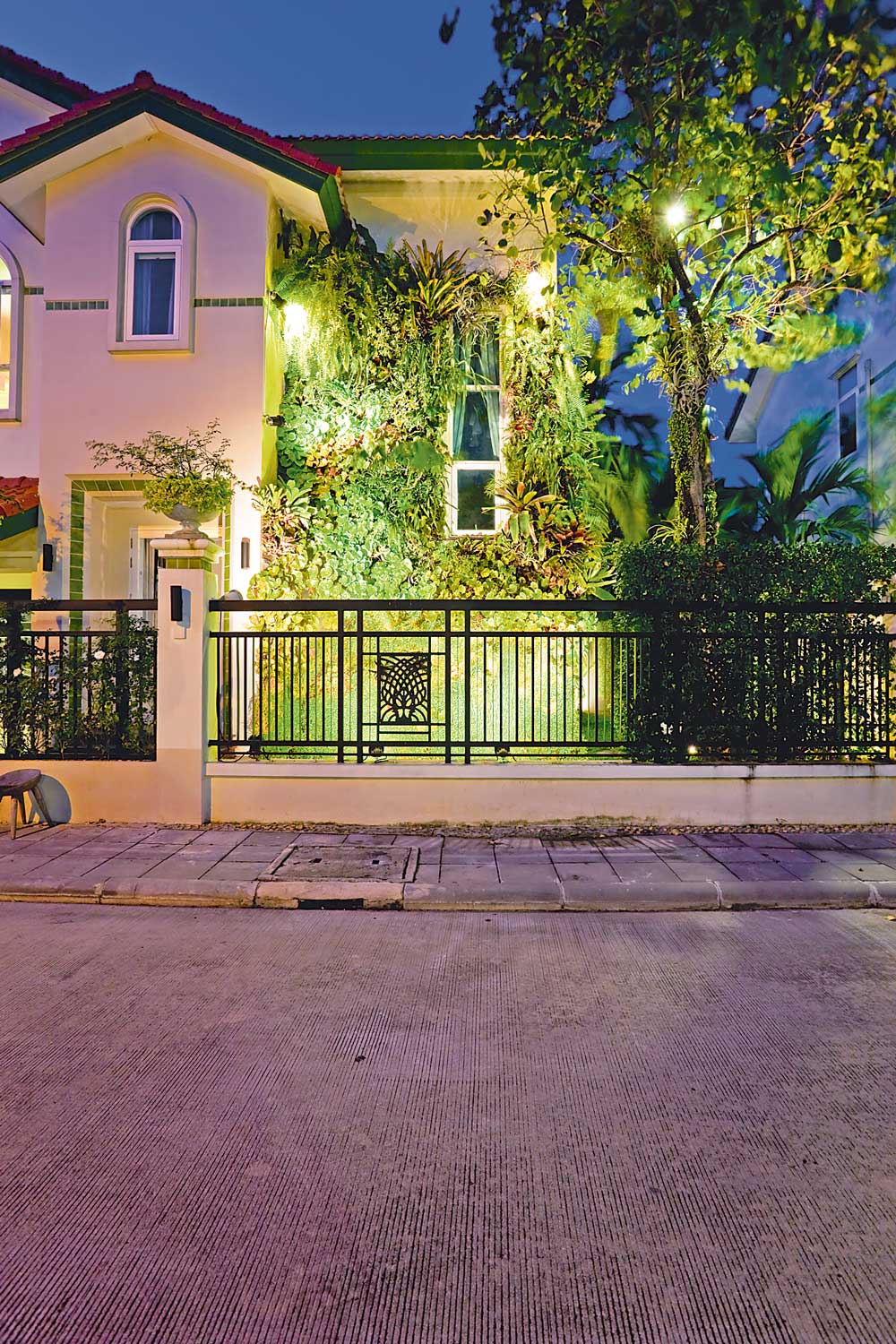 เมื่อย้ายมาบ้านหลังนี้ ได้พัฒนาระบบของสวนแนวตั้งจากบ้านหลังเดิม โดยเริ่มจากเลือกทำเลผนังก่อนว่าจะทำผนังด้านไหน ครั้งแรกจะทำผนังด้านหลังเพียงผนังเดียวแต่เมื่อมาคิดอีกที อยากทำผนังหน้าบ้านด้วยเพือให้ดูแปลกตาและเป็นผนังสีเขียวสำหรับคนที่เดินผ่านไปมา ประกอบกับผนังด้านหน้าหันรับแสงแดดช่วงบ่าย การมีสวนแนวตั้งจึงช่วยให้บ้านเย็นขึ้น