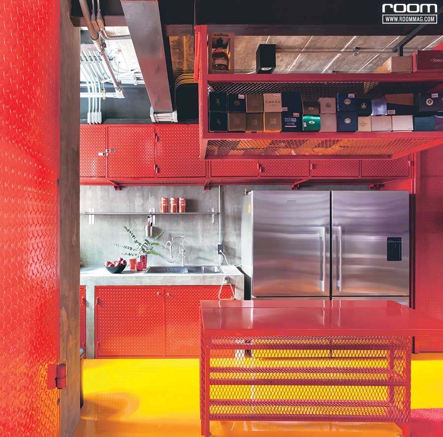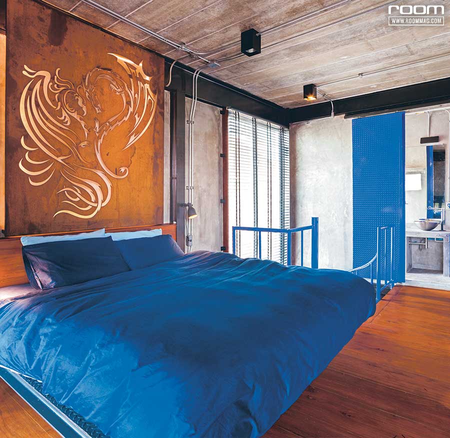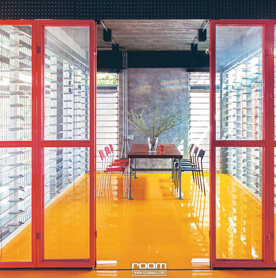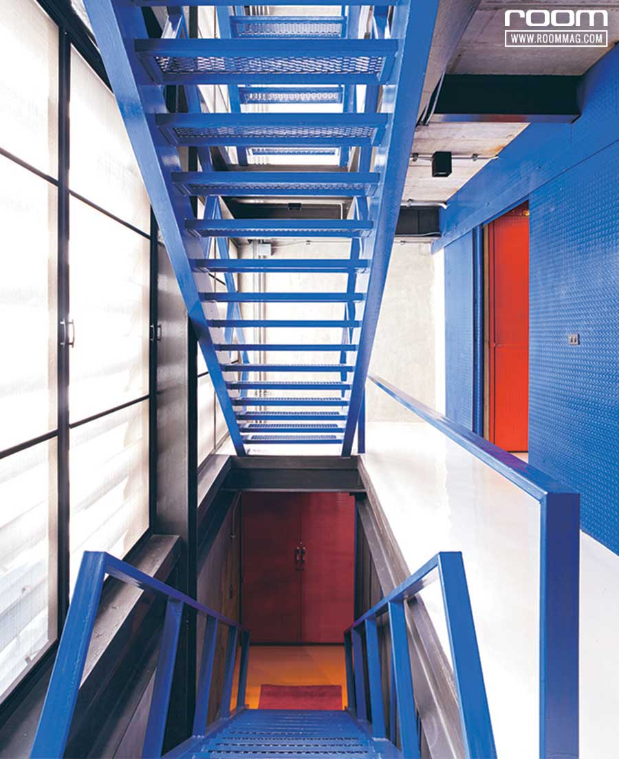 บ้าน 4 ชั้น รูปทรงกล่องสี่เหลี่ยมผืนผ้า มีพื้นที่ใช้สอยรวม 415 ตารางเมตร เน้นออกแบบฟังก์ชันใช้งานให้มีประสิทธิภาพแม้อยู่บนพื้นที่จํากัด โดยมีโถงบันไดทําหน้าที่เป็นแกนหลักเชื่อมต่อความสัมพันธ์ของพื้นที่ต่าง ๆ ในบ้าน  ออกแบบด้วยแนวคิดมินิมัลไม่ได้หยุดอยู่แค่ลุคของบ้าน การตกแต่งภายในเน้นโชว์สัจวัสดุสไตล์ลอฟต์ นําไม้ที่ได้จากการรื้อถอนบ้านหลังเก่ามาปรับใช้เป็นชั้นหนังสือและโต๊ะทํางาน ส่วนเฟอร์นิเจอร์บิลท์อินออกแบบเป็นพิเศษด้วยการนําวัสดุที่ใช้ในงานอุตสาหกรรมมาเป็นวัสดุหลัก เช่น ท่อน้ำเหล็ก ตะแกรงเหล็กฉีก ฯลฯ รวมถึงนําแม่สีมาใช้แต่งแต้มให้บ้านดูมีชีวิตชีวา โดยมี 3 สีไฮไลต์ คือ สีแดงใช้ โค้ดสีเดียวกับตู้ดับเพลิง สีเหลืองใช้โค้ดสีเดียวกับ เส้นถนนทางหลวง และสีน้ําเงิน Majorelle Blue ซึ่งมีแรงบันดาลใจจาก Jardin Majorelle Garden เมื่อคร้ัง ไปเที่ยวเมืองมาราเกซ ประเทศโมร็อกโก