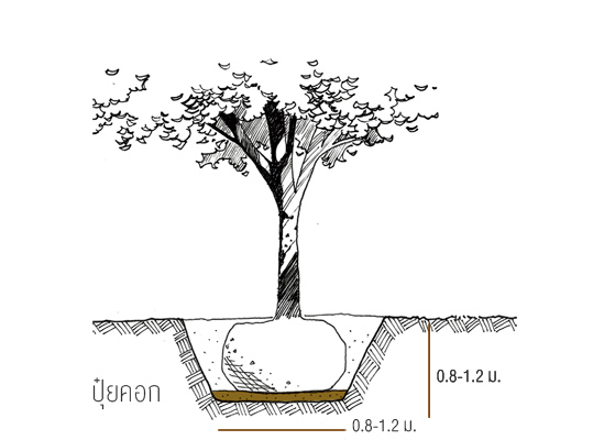 ขุดหลุม รอไว้ให้มีปากหลุมกว้างประมาณ 0.80 – 1.20 เมตร รวมถึงความลึกที่ควรสัมพันธ์ กับความกว้างด้วยเช่นกัน จากนั้นรองก้นหลุมด้วยปุ๋ยคอกประมาณ 10 – 20 เซนติเมตร เพื่อให้รากของต้นไม้ได้รับธาตุอาหารเพียงพอต่อความต้องการ
