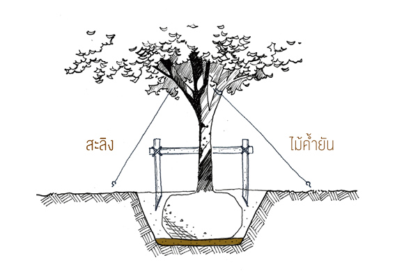 เมื่อเราเตรียมทุกอย่างไว้เรียบร้อยแล้วก็ทำการย้ายต้นไม้ลงดิน ที่สำคัญ อย่าลืมแกะตาข่ายที่ห่อตุ้มดินออกด้วยนะครับ เพราะจะทำให้ต้นไม้ตายได้ เนื่องจากรากไม่สามารถแทงทะลุตาข่ายออกมาดูดซับอาหารได้ แถมต้องเสียเวลารื้อออกมาใหม่อีกต่างหาก จากนั้นใช้ไม้ค้ำทรงต้นหรือใช้สะลิงยึดเพื่อให้ต้นตั้งตรงใช้ระยะเวลาประมาณ 1 ปี เพื่อให้ต้นไม้ปรับสภาพจนอยู่ตัว ป้องกันการล้มหรือเอนเวลาเจอลมแรง