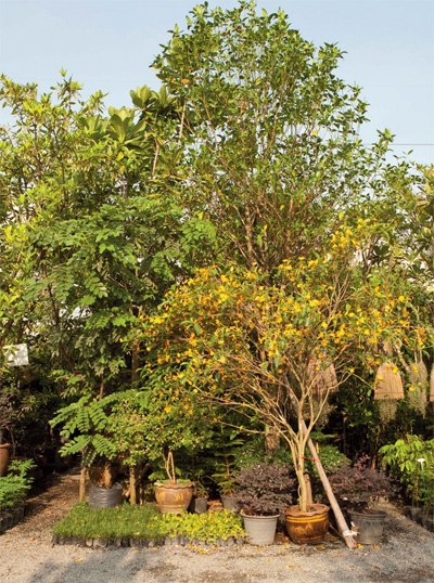 ได้แก่ ลั่นทมพันธุ์ขาวพวง กันเกรา สาละลังกา ขนุน คูน มะยม และไม้ดอกหอม เช่น จำปี จำปา ปีบ ลำดวน แต่หากจะให้เหมาะกับคนเมืองที่ไม่ค่อยมีเวลาดูแลต้นไม้มากนัก คนส่วนใหญ่จึงเลือกต้นไม้ที่มีใบสีเขียวตลอดปี และใบไม่ร่วงมาก เช่น ตีนเป็ดน้ำ จิกน้ำ จิกทะเล ส่วนต้นที่เมื่อก่อนเคยฮิตติดอันดับ เช่น พญาสัตบรรณ แม้จะมีฟอร์มต้นสวยงาม แต่บางคนอาจไม่ปลื้มกลิ่นฉุนจากดอกที่โชยมาตามลม ดมกันจนเวียนหัวเลยละครับ สำหรับต้นไม้ที่ปลูกและดูแลง่าย ได้แก่ ตีนเป็ดน้ำ ลั่นทม ตะแบก หูกระจง ชงโค