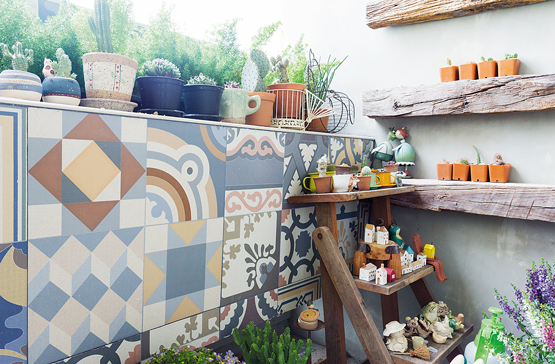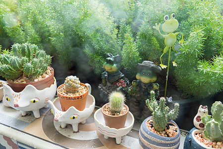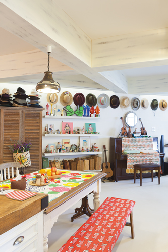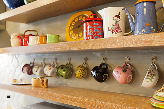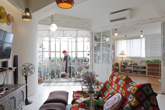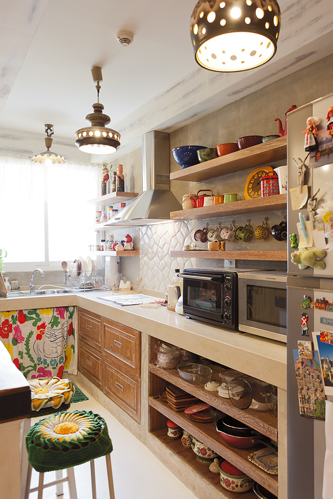 ในมุมครัวตกแต่งอย่างเรียบง่ายโดยได้สีสันสดใสจากบรรดาถ้วยจานชามเซรามิก รวมไปถึงเครื่องครัวอื่นๆซึ่งคุณลุลาเริ่มสะสมจากการเดินทางไปท่องเที่ยวต่างประเทศทั้งเยอรมนี ญี่ปุ่นและไต้หวันในช่วง 2-3 ปีหลังจากที่คิดทำบ้าน ส่วนโต๊ะไม้ตรงกลางสั่งทำพิเศษให้ขนาดพอดีกับพื้นที่ตรงกลางของห้องเป็นไอส์แลนด์สำหรับเตรียมอาหารและเก็บเครื่องครัวต่างๆต่อกับโต๊ะรับประทานอาหารอีกตัว ถัดไปก่อนถึงระเบียงเป็นมุมรับแขกและนั่งพักผ่อนดูโทรทัศน์ ซึ่งรายล้อมด้วยบรรดาของสะสมที่โปรดปรานตั้งแต่หมวก กระเป๋าหวาย ตุ๊กตาตัวเล็กกระจุกกระจิก รวมถึงมุมเปียโนและเครื่องดนตรีชนิดต่างๆด้วยคุณลุลามักใช้นั่งเล่นแต่งเพลงในบางเวลา ทั้งหมดนี้ช่วยเติมความมีชีวิตให้คอนโดมีเนียมแห่งนี้มีความเป็นบ้านที่ดูแล้วอบอุ่นยิ่งขึ้น