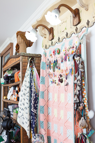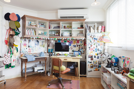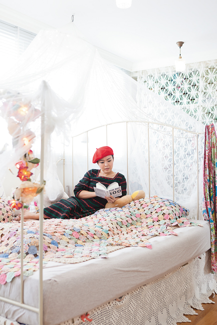 ข้างประตูกระจกที่เชื่อมไปยังสวนระเบียงมีประตูกระจกอีกบานที่พาเราเข้าไปสำรวจห้องนอนของเธอภายในดูสว่างด้วยหน้าต่างบานใหญ่ที่ยาวไปตลอดแนวผนัง ที่สะดุดตาคงเป็นเตียงนอนสีชมพูอ่อนคลุมด้วยม่านบางๆที่ห้อยลงมาจากเพดานด้านบนมีหลอดไฟดวงเล็กประดับรอบๆรับกับฉากหลังที่เป็นผ้าถักมาคราเม่สีขาวซึ่งใช้คลุมตู้เสื้อผ้าดูราวกับเตียงของเจ้าหญิงในนิทาน มุมข้างๆก็ดูโดดเด่นไม่แพ้กันเป็นโต๊ะทำงานของคุณลุลา ทั้งงานออกแบบอัลบั้มงานเพลงในปัจจุบัน วาดภาพทำงานศิลปะและผลงานออกแบบตัดเย็บเสื้อผ้ารวมถึงของใช้ในบ้านจากแบรนด์ธุรกิจส่วนตัวทางออนไลน์ที่ใช้ชื่อ“Lula Home Style” ซึ่งมีที่มาจากความชื่นชอบในงานฝีมือประกอบกับชอบค้นหาสิ่งใหม่ๆทำอยู่ตลอดเวลา ไม่แปลกใจเลยที่ผลงานของเธอล้วนแต่มีความน่าสนใจดูไม่หยุดนิ่ง