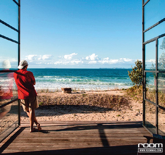 เมื่อเปิดประตูกระจกหน้าบ้านออก เราจะมองเห็นวิวทะเลได้อย่างเต็มตา ออกแบบให้ผนังหน้าบ้านเป็นโครงเหล็กกรุกระจกที่เปิดออกได้อย่างเต็มที่ ขยายพื้นที่บ้านที่เคยแคบให้มีมิติ กลายเป็นพื้นที่พักผ่อนกึ่งเอ๊าต์ดอร์