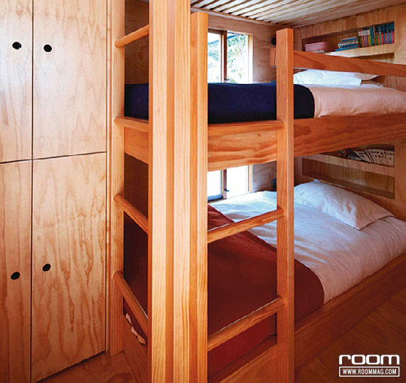 ห้องนอนขนาดเล็กสำหรับเด็กๆ ซึ่งอยู่ด้านหลังทำเป็นเตียงสามชั้นเพื่อประหยัดพื้นที่ เลือกใช้เตียงแบบสองชั้นหรือสามชั้นก็ช่วยประหยัดพื้นที่ได้มาก