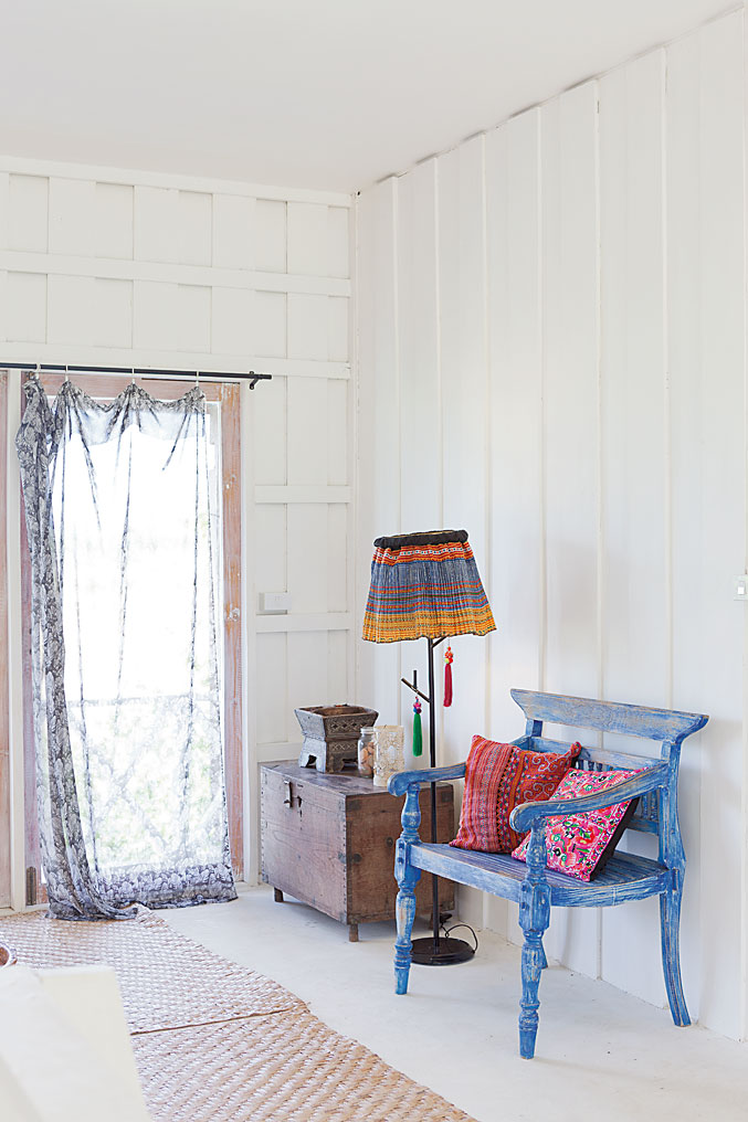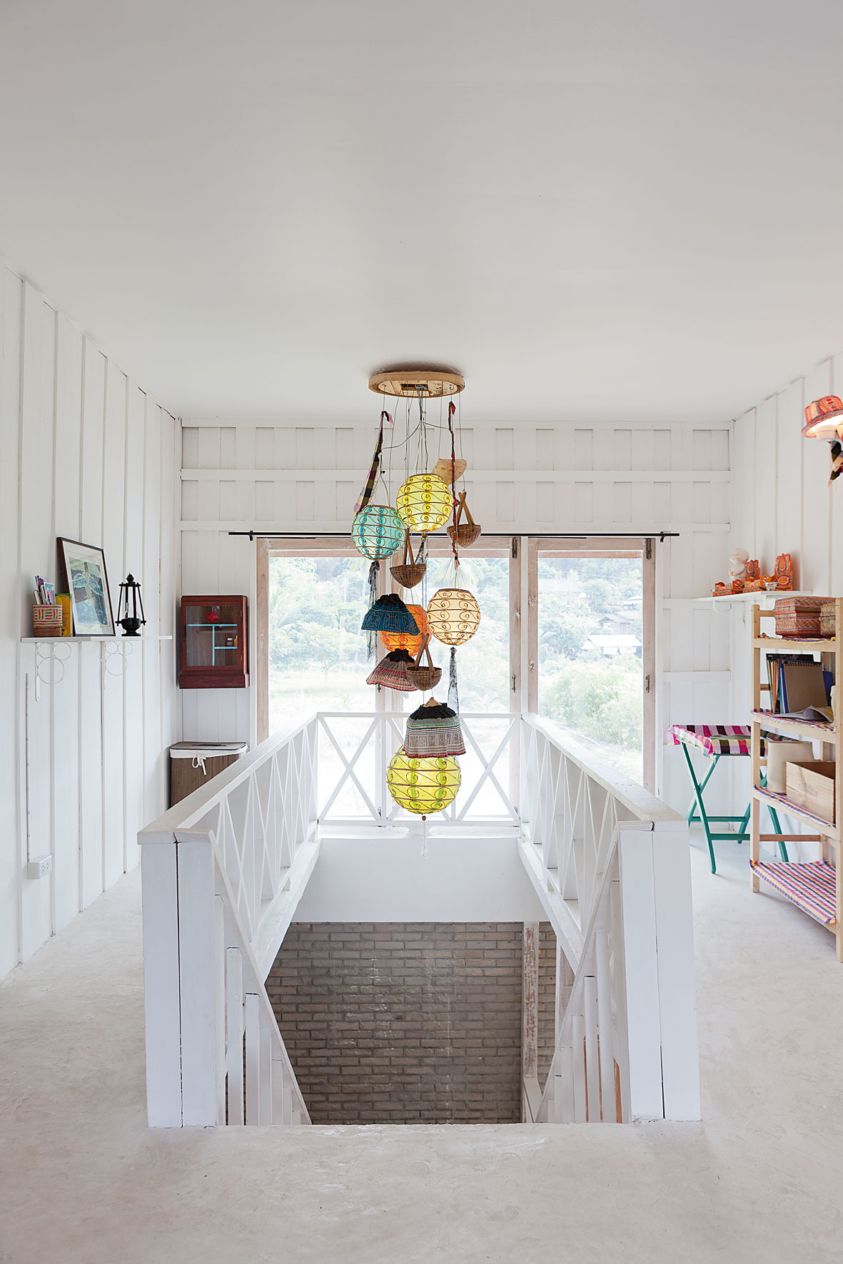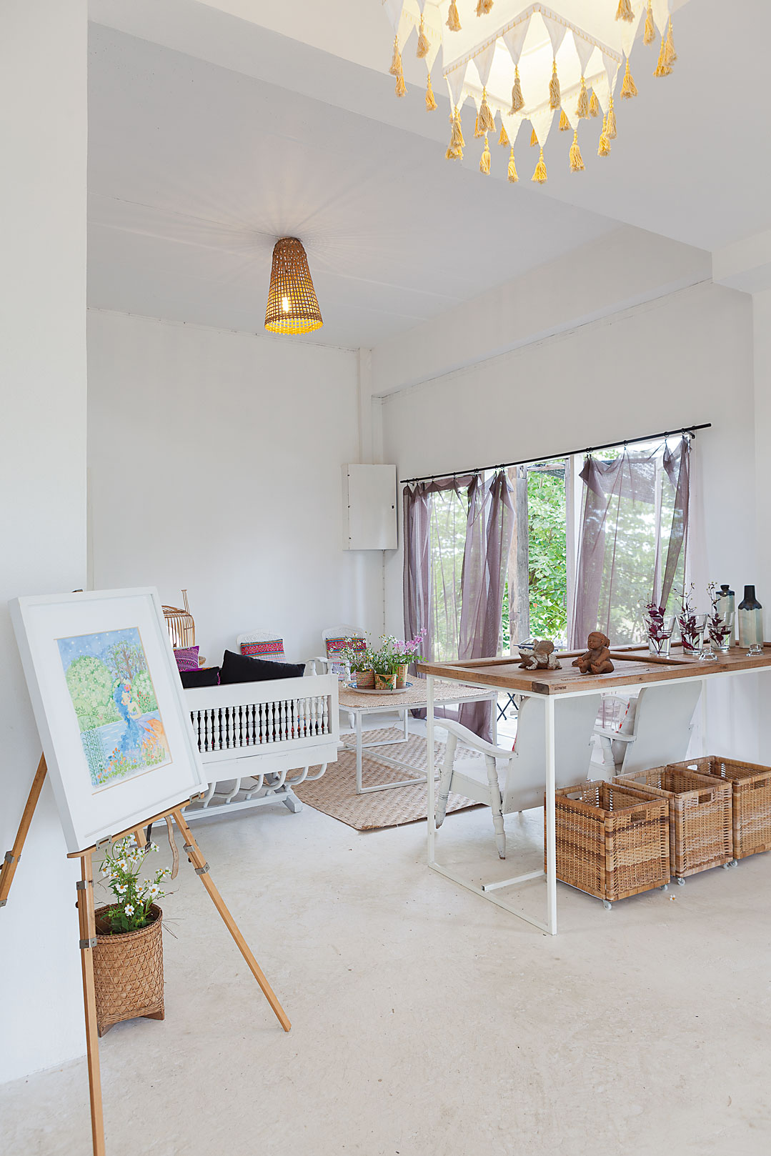 ภายในบ้านยังคงใช้สีขาวเช่นเดียวกับภายนอก จึงได้ความรู้สึกเชื่อมต่อกัน ทั้งยังดูสะอาดตาและโล่งสบายรับกับแสงสว่างจากหน้าต่างและประตูระเบียง ตกแต่งด้วยเฟอร์นิเจอร์ไม้สีธรรมชาติและสีขาว บางชิ้นก็ย้อมเสี้ยนขาวเพื่อสร้างความรู้สึกอบอุ่น โดยมีทั้งของเก่าและงานที่ประยุกต์มาจากของเก่า เช่น โต๊ะจากบานประตูและลูกกรง แต่สิ่งที่ทำให้การตกแต่งบ้านหลังนี้โดดเด่นไม่ซ้ำใครก็คืองานศิลปะ งานฝีมือ และงานหัตถกรรมพื้นบ้านผ่านการนำมาดัดแปลงจากความคิดสร้างสรรค์ของคุณฟ้าใสและสถาปนิก กลายเป็นของประดับน่ารักๆที่ช่วยให้บ้านดูน่าสนใจและมีชีวิตชีวามากยิ่งขึ้นตัดกับความเรียบของสีขาวที่เป็นพื้นหลัง