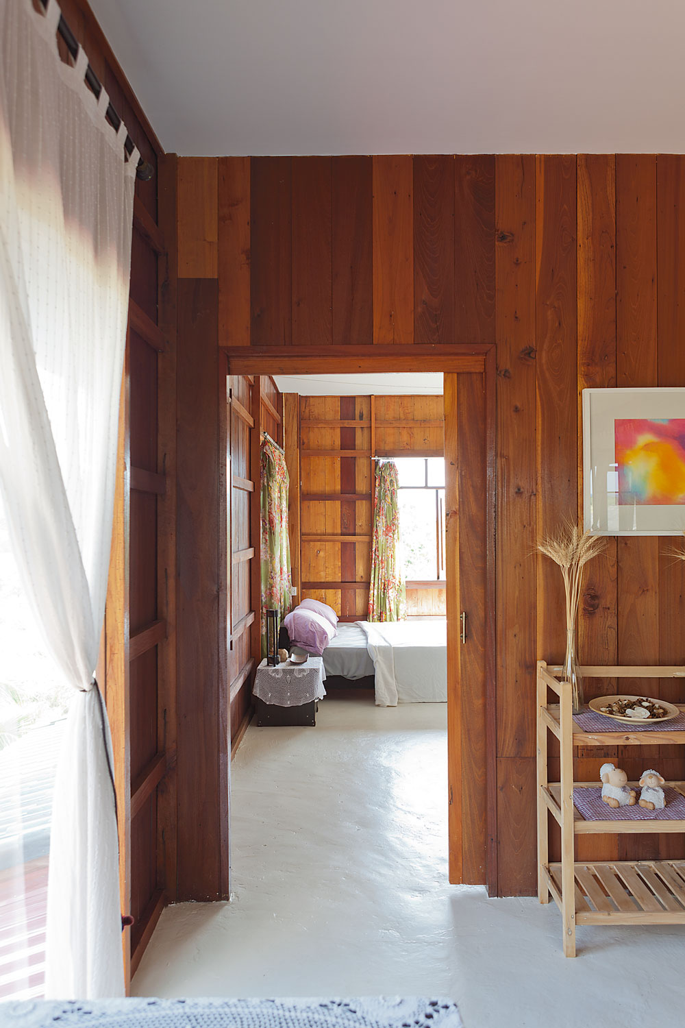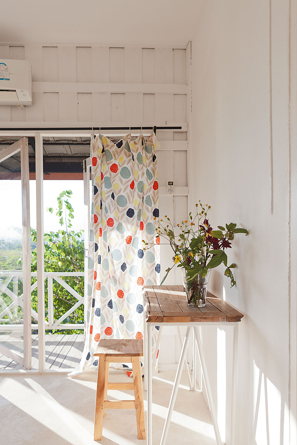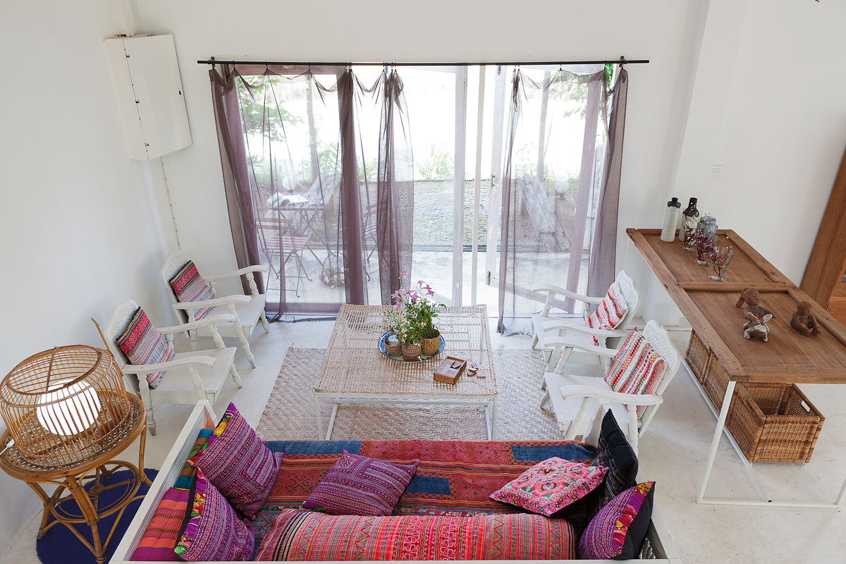 ภายในบ้านยังคงใช้สีขาวเช่นเดียวกับภายนอก จึงได้ความรู้สึกเชื่อมต่อกัน ทั้งยังดูสะอาดตาและโล่งสบายรับกับแสงสว่างจากหน้าต่างและประตูระเบียง ตกแต่งด้วยเฟอร์นิเจอร์ไม้สีธรรมชาติและสีขาว บางชิ้นก็ย้อมเสี้ยนขาวเพื่อสร้างความรู้สึกอบอุ่น โดยมีทั้งของเก่าและงานที่ประยุกต์มาจากของเก่า เช่น โต๊ะจากบานประตูและลูกกรง แต่สิ่งที่ทำให้การตกแต่งบ้านหลังนี้โดดเด่นไม่ซ้ำใครก็คืองานศิลปะ งานฝีมือ และงานหัตถกรรมพื้นบ้านผ่านการนำมาดัดแปลงจากความคิดสร้างสรรค์ของคุณฟ้าใสและสถาปนิก กลายเป็นของประดับน่ารักๆที่ช่วยให้บ้านดูน่าสนใจและมีชีวิตชีวามากยิ่งขึ้นตัดกับความเรียบของสีขาวที่เป็นพื้นหลัง