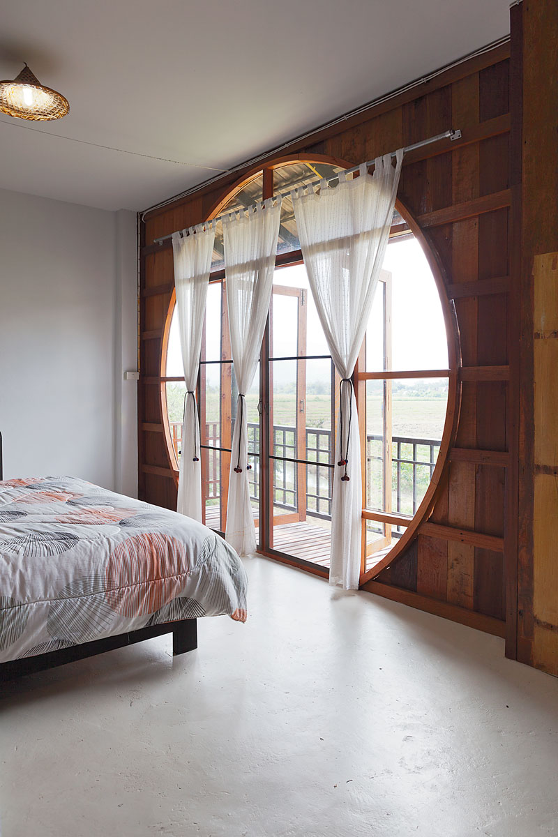 รูปทรงอาคารได้แรงบันดาลใจจากบ้านญี่ปุ่นหลังหนึ่งที่คุณแดงชื่นชอบ จุดเด่นอีกอย่างหนึ่งก็คือการออกแบบในลักษณะสมมาตร เข้ากับประตูหน้าต่างรูปวงกลม สร้างเอกลักษณ์ที่ไม่เหมือนใคร ประกอบกับคุณพรไพลิน ตันเจริญสถาปนิกผู้ออกแบบและดูแลการก่อสร้างที่ใช้เวลาเป็นแรมปีอยู่ที่เชียงดาวเพื่อออกแบบบ้านสองหลังนี้ ก็ได้ดึงเอาเสน่ห์ของเชียงดาวมาจากผืนดินผสมกับคอนกรีตฉาบแต่งเป็นผนังชั้นล่างให้สีแดงที่ดูเป็นธรรมชาติ รับกับชั้นสองที่เป็นโครงสร้างตีผนังด้วยไม้เนื้อแข็งสีน้ำตาลแดง ภายในตกแต่งด้วยเฟอร์นิเจอร์ไม้ลอยตัวเพียงไม่กี่ชิ้น มีหน้าต่างและช่องเปิดกระจายอยู่ทุกมุมห้อง เมื่อประกอบกับการใช้พื้นและเพดานสีขาว พอเข้ามาภายในบ้านจึงดูสว่างและโล่งสบาย ช่วยเบรกความเข้มและมืดทึบของสีแดงจากสีดินและไม้ได้เป็นอย่างดี