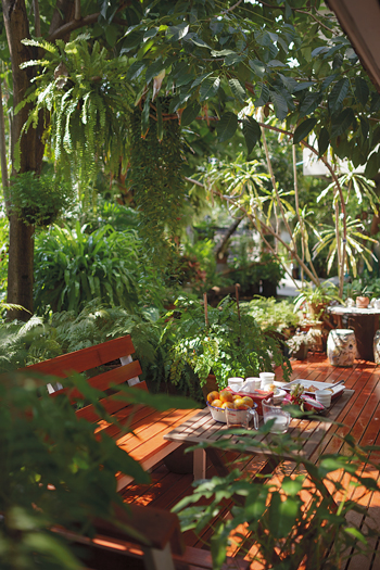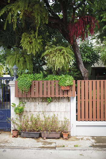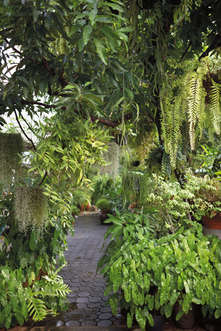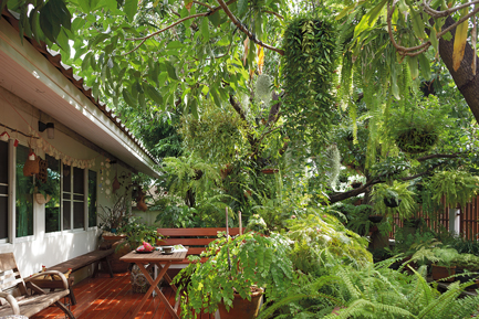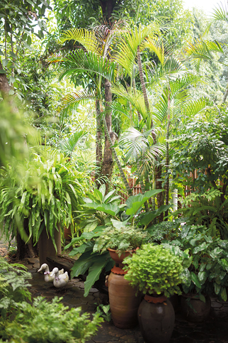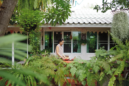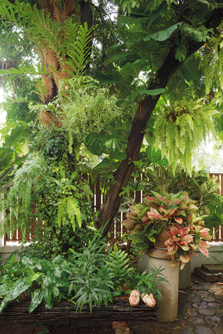 “สวนของดิฉันก็อาศัยจัดเองแบบง่าย ๆ แต่เน้นความร่มรื่นให้ดูเขียว ๆ สบายตา เราจึงเลือกปลูกไม้ใบเสียเป็นส่วนใหญ่ โดยเฉพาะเฟินสายพันธุ์ต่าง ๆ เช่น ข้าหลวง สไบนาง ใบมะขาม ขนนก นาคราช ฯลฯ เพราะเป็นพรรณไม้ที่รู้สึกว่าดูแลง่าย อยู่ได้กับสวนที่ค่อนข้างร่มโดนแดดน้อย และมีราคาไม่แพงมาก เราเลือกซื้อตอนเป็นต้นเล็ก ๆ ไม่กี่ต้น แล้วนำมาขยายพันธุ์เอง เพียงใช้กาบมะพร้าวสับแช่น้ำทิ้งไว้ค้างคืน แล้วใส่ในกระถางดินเผาหรือตะแกรงปลูกไม้แขวน จากนั้นตัดก้านเฟินมาปักชำ เติมปุ๋ยละลายช้าเพิ่มธาตุอาหาร หมั่นรดน้ำให้ชุ่มชื้น ซึ่งวิธีนี้ยังใช้ขยายพันธุ์พรรณไม้อื่น ๆ ได้อีกด้วยอย่าง เดป ไก่ลาย ไข่มุก ริปซาลิส ฯลฯ ก็เติบโตงอกงามดีค่ะ”