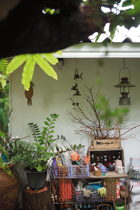 เมื่อสอบถามถึงรูปแบบของสวนแห่งนี้ซึ่งจัดเป็นสวนกระถาง คุณตู่จึงอธิบายเพิ่มเติมว่า “เพราะดินของที่นี่ค่อนข้างแข็ง ไม่เหมาะสำหรับปลูกพรรณไม้ และมักมีน้ำขังตอนฝนตกหนัก จึงเลือกแก้ปัญหาโดยการปูพื้นบล็อกซีเมนต์และปูอิฐมอญ ช่วยให้พื้นสวนไม่แฉะ ทั้งยังสะดวกเวลาเดิน เลยเลือกปลูกต้นไม้ใส่กระถางดินเผาซึ่งเก็บความชื้นได้ดี และวางบนท่อนไม้หรือซ้อนกระถางสูง เพื่อป้องกันรากเน่าตอนมีน้ำขัง และเคลื่อนย้ายสะดวกด้วย พอต้นไม้มีขนาดใหญ่ขึ้น ก็เปลี่ยนขนาดกระถางกันใหม่ บางส่วนใช้กระถางแขวน เราปีนขึ้นไปแขวนกับกิ่งไม้เองเลยค่ะ ลูกๆก็เป็นห่วงแม่ แต่เราทำแบบนี้มาตั้งแต่สาวๆ เรียกว่าชำนาญ (ยิ้ม) ตอนนี้ก็ยังมีแอบปีนแขวนเองอยู่บ้าง เพราะชอบให้มีไม้แขวน กิ่งใบห้อยเป็นสายดูพลิ้วสวย สบายตา”