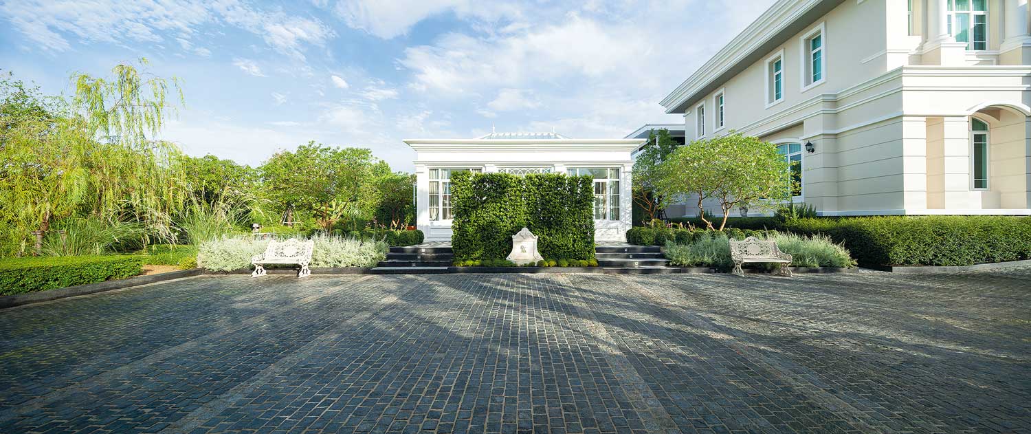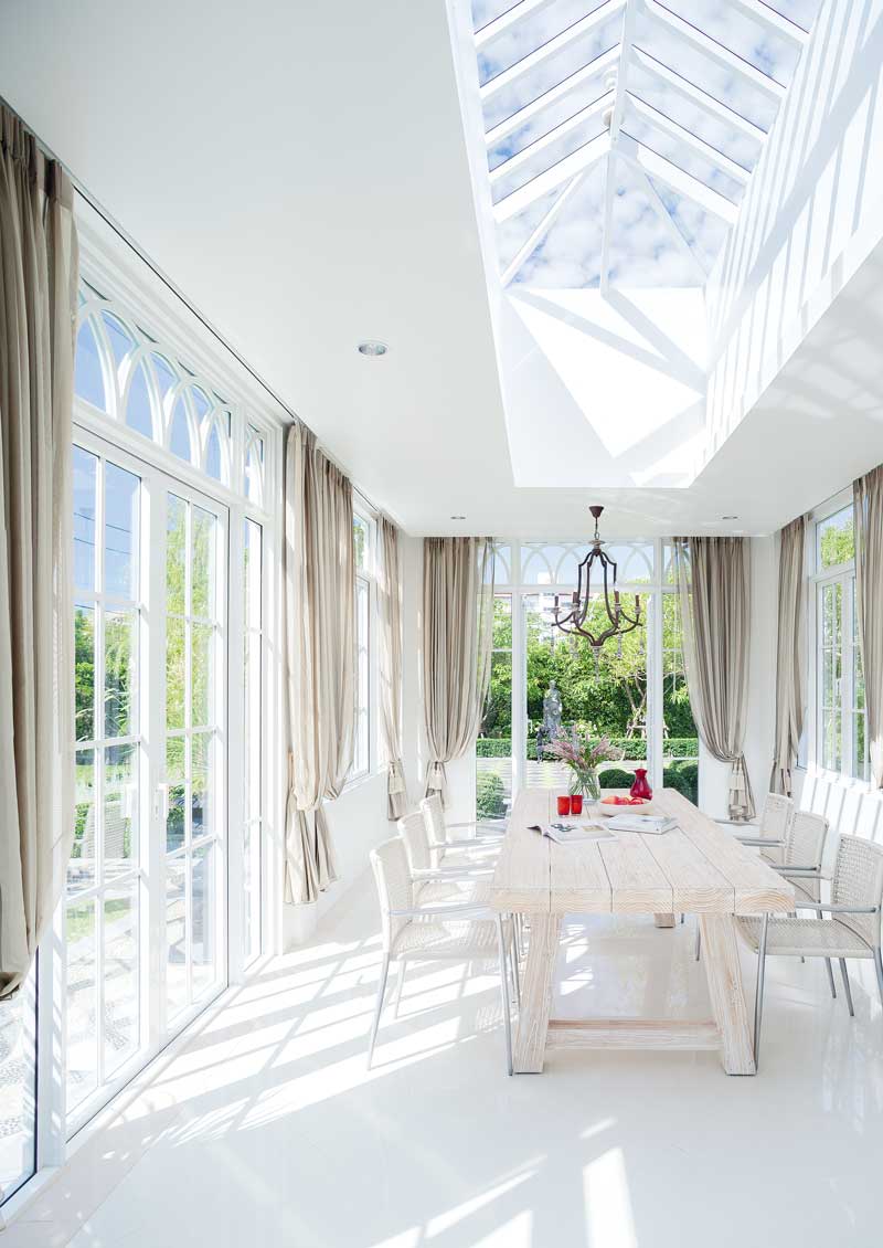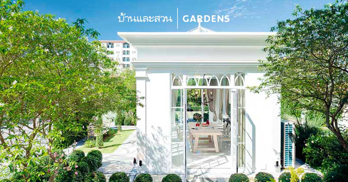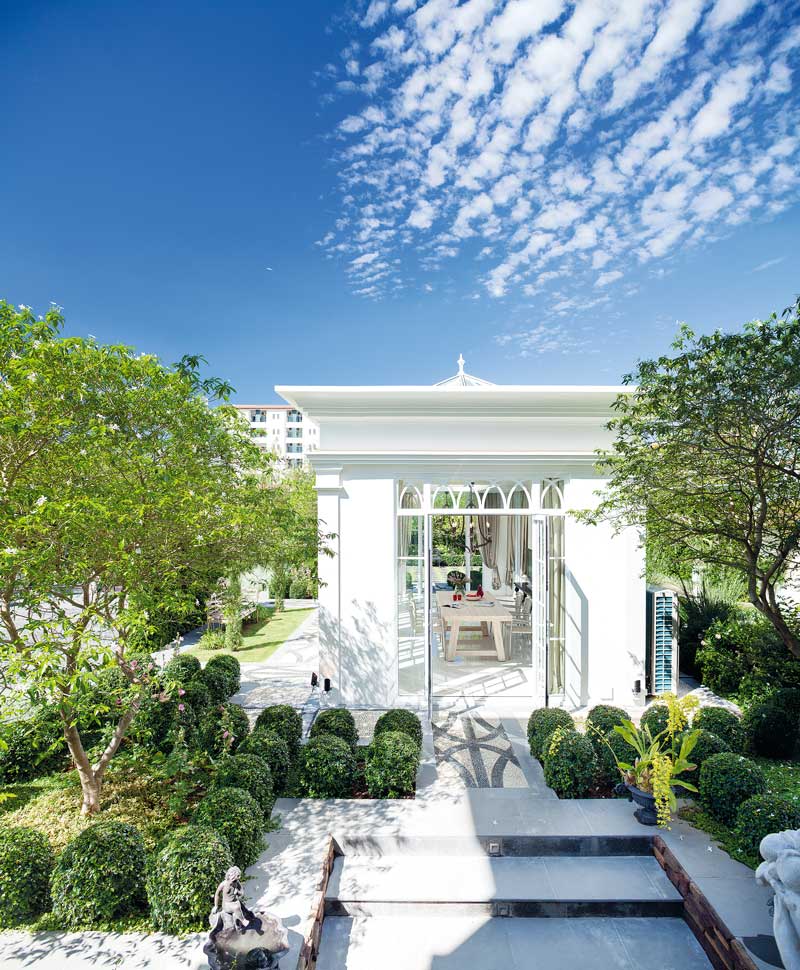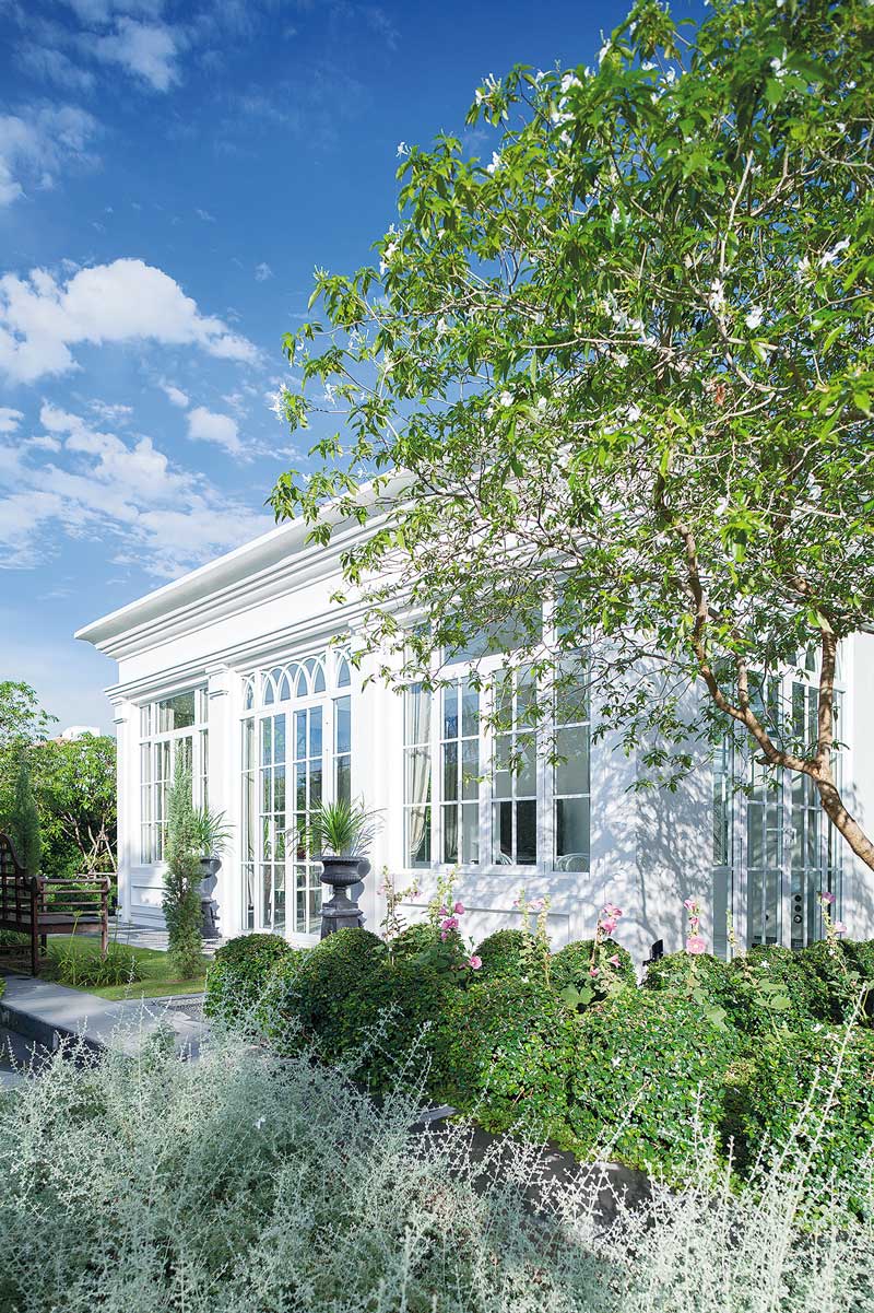 เรือนกระจกสีขาวสไตล์โมเดิร์นคลาสสิกแวดล้อมด้วยต้นไม้ตัดพุ่มเป็นระเบียบเรียบร้อยของบ้านหลังนี้ชวนให้นึกถึงบรรยากาศจิบน้ำยามบ่ายภายใน สวนยุโรป แสนสวยสักที่หนึ่ง