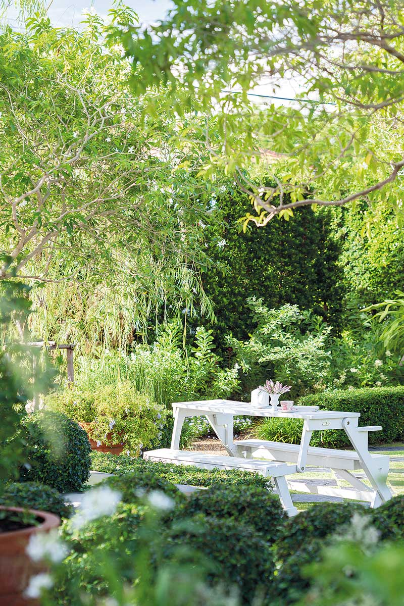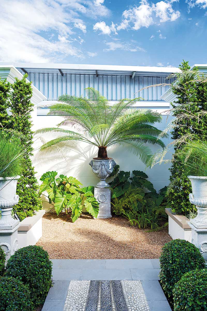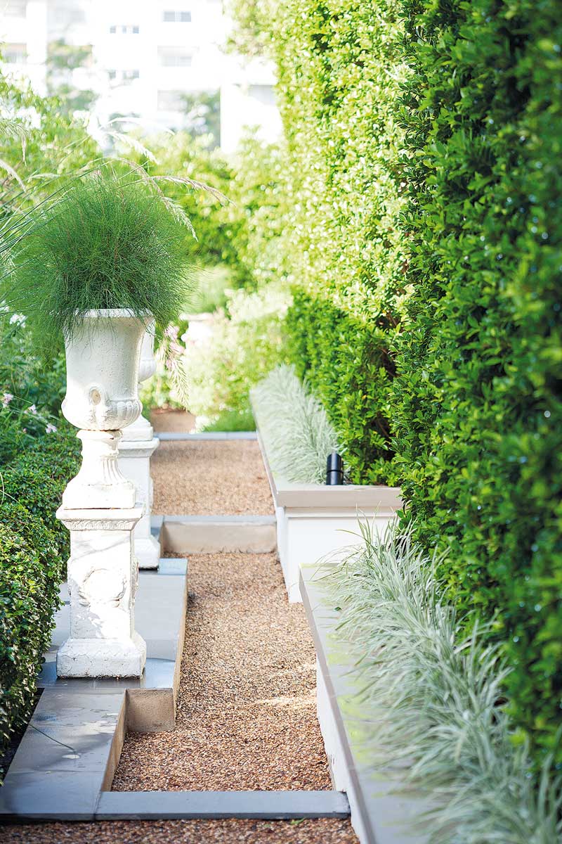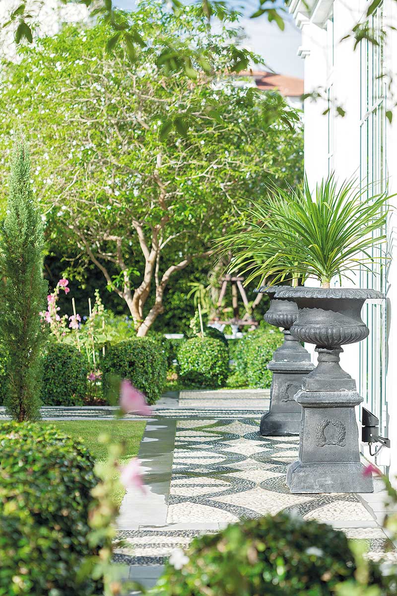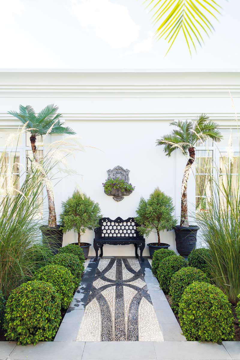 การออกแบบสวนให้เปิดโล่งนำเอาเส้นสายของสวนแบบฟอร์มัลเข้ามาใช้ ทำให้สวนดูเป็นระเบียบเรียบร้อยและดูแลง่าย ประกอบกับการเลือกโทนสีของฮาร์ดสเคปที่เน้นโทนสีขาวและดำ เมื่อรวมเข้ากับต้นไม้สีเขียวตัดพุ่ม ก็เสริมให้สวนดูโก้หรู มีความเป็นทางการนิดๆ แต่ไม่อึดอัดด้วยการเลือกใช้พรรณไม้ที่มีเส้นสายสบาย ๆ นับเป็นส่วนผสมของความหวานและความเท่ที่จับคู่กันได้อย่างเหมาะเจาะลงตัว