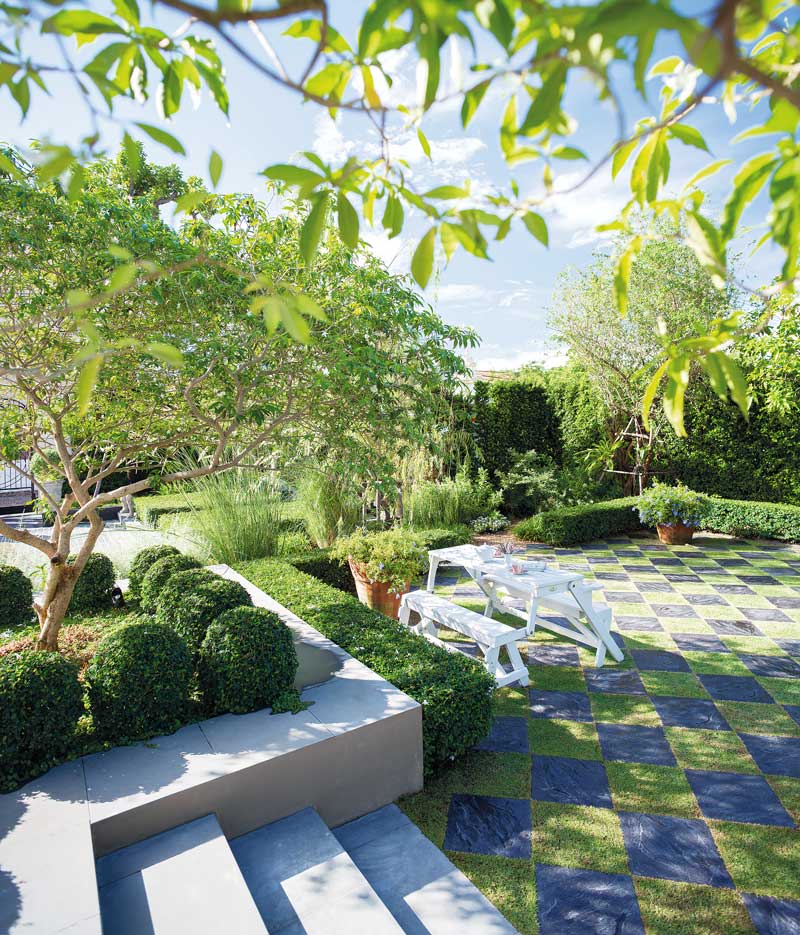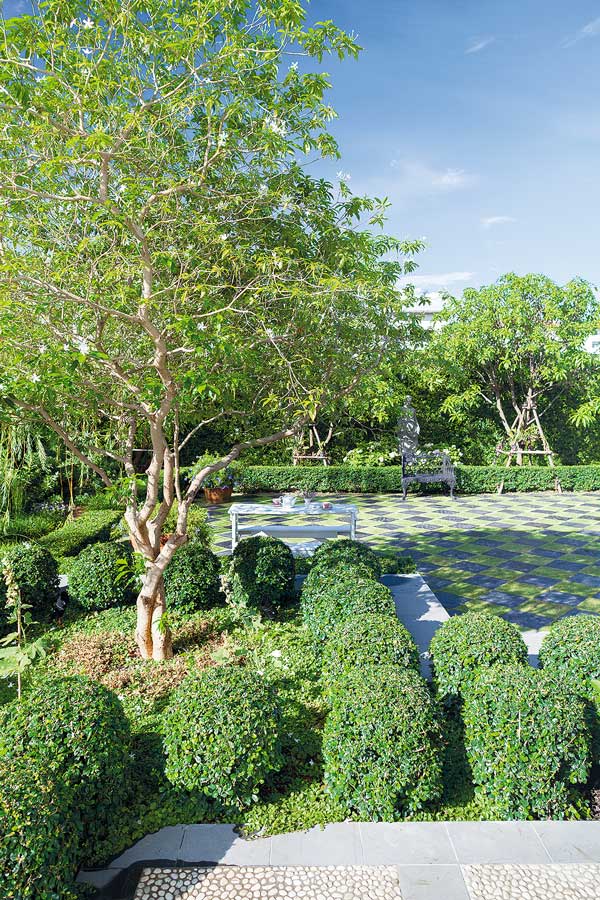 สวนแห่งนี้นำเอาลักษณะของสวนแบบฟอร์มัลหรือสมมาตรเข้ามาใช้ ทำให้พื้นที่เป็นสัดส่วน มีต้นไม้ตัดพุ่มกลมตามสไตล์สวนยุโรป แต่ก็ผสมผสานไม้รูปทรงอิสระสร้างบรรยากาศสบาย ๆ เป็นธรรมชาติ บริเวณเรือนกระจกปลูกต้นไม้ให้เท่ากันทั้งสองด้าน มีลานอเนกประสงค์อยู่ฝั่งหนึ่งของเรือนกระจก ปูแผ่นทางเดินสลับกับหญ้าเป็นลวดลายตารางหมากรุก ใช้เป็นทั้งพื้นที่พักผ่อนและลานบาร์บีคิว ไม้ประธานในสวนส่วนใหญ่เลือกชนิดที่มีฟอร์มสวยโชว์เส้นสายที่ดูโดดเด่น โดยเฉพาะพะยอม 2 ต้นบริเวณริมรั้ว นอกจากจะสวยงามแล้วยังตั้งใจปลูกเพื่อบังเสาไฟที่อยู่ด้านนอกด้วย