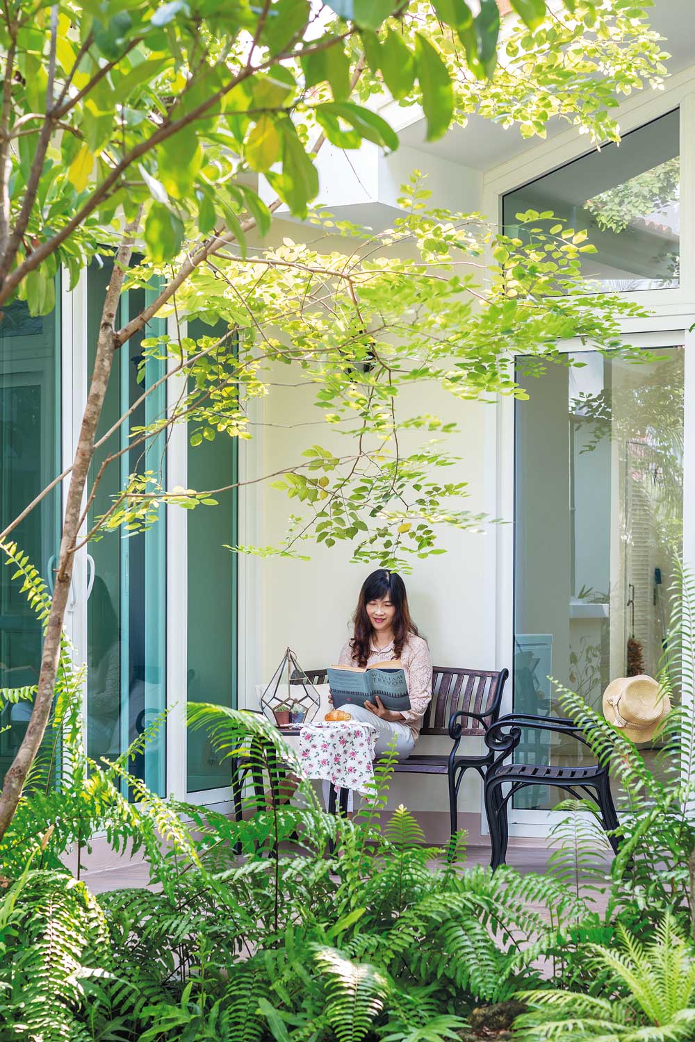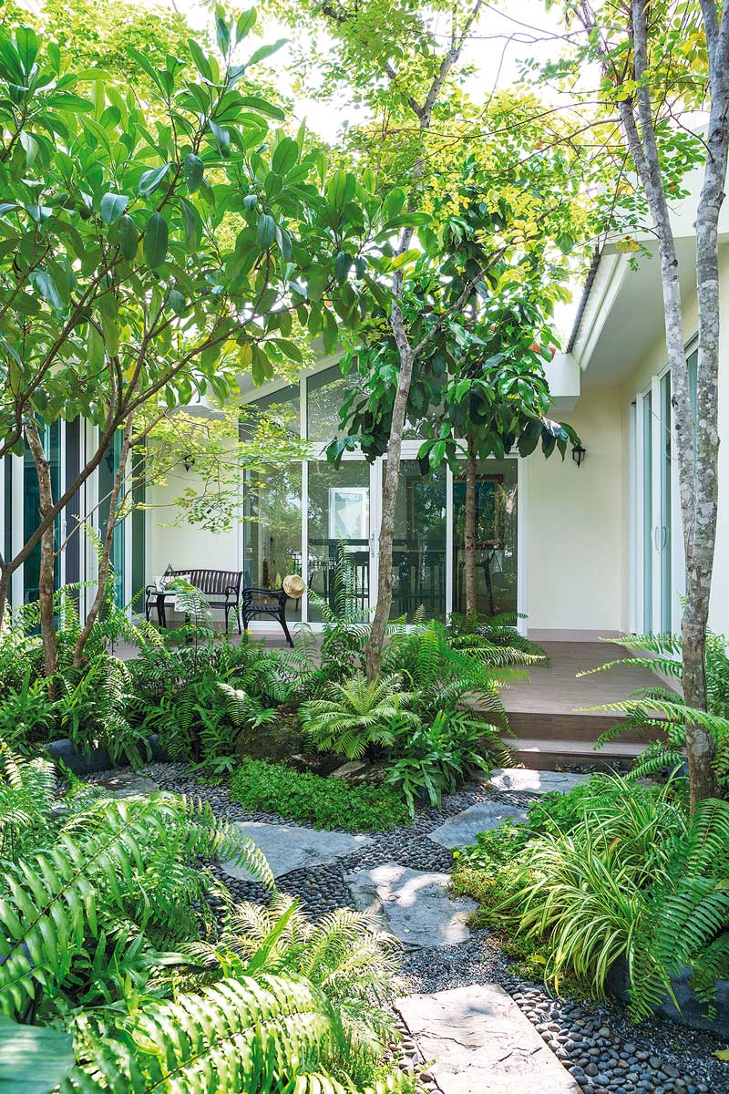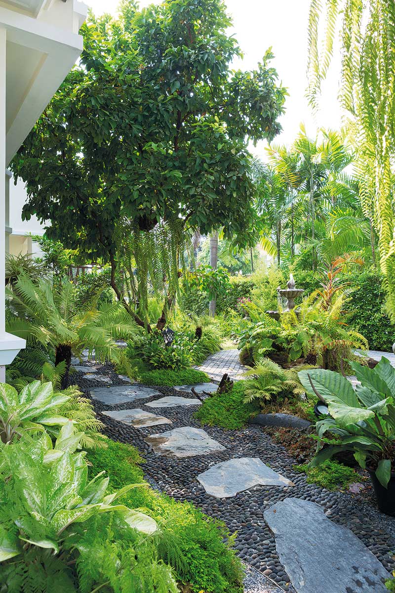 สวนนี้มีการวางผังบริเวณแบบง่ายๆ หน้าบ้านทำเป็นมุมนั่งเล่นพักผ่อน โอบล้อมด้วยกำแพงต้นไทรเกาหลีตัดแต่งจนเป็นพุ่มแน่นสวยงาม มีทางเดินหินกาบผสมกับกรวดแสตมป์เรียงตัวกันทั้งผืนทอดยาวอ้อมไปยังระเบียงนั่งเล่นอีกฝั่งตัวของบ้าน และมีกลุ่มไม้พุ่มขนาบข้างซ้ายขวาตลอดทั้งเส้นทางเดิน กรวดแต่ละก้อนบนพื้นที่วางเรียงต่อกันไปเรื่อยๆอย่างตั้งใจ กลุ่มพรรณไม้ผิวสัมผัสใบละเอียด รวมไปถึงหินค็อบเบิลก้อนเล็กๆที่วางรวมกันจนกลายเป็นลานขนาดใหญ่ รายละเอียดเล็กๆน้อยๆเหล่านี้เองที่มีส่วนทำให้สวนสวยแห่งนี้เต็มไปด้วยความละมุนละไมและรื่นรมย์อย่างที่เจ้าของบ้านปรารถนา