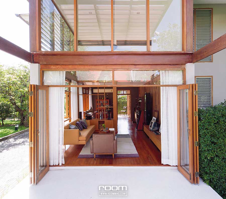 ออกแบบพื้นที่ใช้สอยภายในบ้านมีการปรับเปลี่ยนบางส่วนเพื่อให้สอดคล้องกับวิถีชีวิตของครอบครัวสมัยใหม่ ไม่ว่าจะเป็นการต่อเติมพื้นที่รับแขกกับส่วนนั่งเล่นให้ใหญ่ขึ้น รวมถึงเพิ่มดับเบิ้ลสเปซโดยรื้อห้องพระบริเวณชั้น 2 ออก ออกแบบห้องรับประทานอาหารเข้ามา ไว้ในตัวบ้าน ควบคู่ไปกับการต่อเติมและเพิ่มพื้นที่ระเบียง บริเวณช้ันล่างเพื่อเปิดรับธรรมชาติรอบบ้าน ชวนให้ออกมานั่งเล่นชมสวนตามมุมต่างๆ ทําเป็นดับเบิ้ลวอลุ่ม ช่วยให้ส่วนนั่งเล่นโปร่งโล่งกว่ามุมไหนๆ ด้านล่างเลือกใช้ประตูไม้บานเฟี้ยมสไตล์เดียวกับของเดิมของบ้าน ส่วนผนังด้านบนออกแบบเป็นช่องหน้าต่างไม้กรุกระจกใส รับแสงธรรมชาติได้ตลอดทั้งวัน