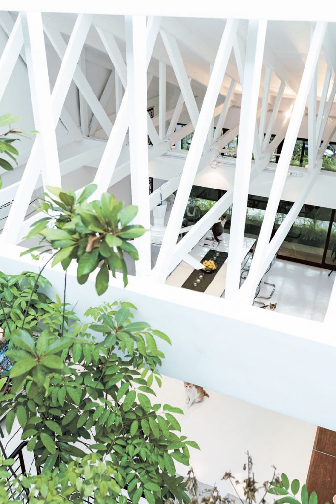 บ้านหลังนี้ถูกออกแบบภายใต้แนวคิดที่อยากให้บ้านเป็นสิ่งน่าอยู่ รวม 2 คูหา โดยทุบผนังกั้นระหว่างคูหาออกทำให้ได้พื้นที่ใช้สอยเพิ่มขึ้น ภายในแทบไม่มีผนังทึบกั้นให้รู้สึกอึดอัด เช่น ห้องนั่งเล่น และห้องรับประทานอาหาร ชั้นสองก็จัดแปลนแบบ บ้าน open plan ซึ่งทั้งโปร่งสบาย และระบายความร้อนสู่ภายนอกได้เป็นอย่างดีบันไดหลักของบ้านถูกทุบ และสร้างใหม่ในตำแหน่งที่เหมาะสมมากขึ้น จากชั้นล่างขึ้นสู่ชั้นสองเป็นขั้นบันไดเหล็กที่โปร่งโล่ง ด้านข้างคือคอร์ตกลางบ้านที่ปลูกต้นไม้สูงขึ้นไปยังชั้นสองซึ่งเป็นพื้นที่พักผ่อนหลักต้นไม้ช่วยสร้างบรรยากาศให้เหมือนอยู่ภายนอกได้ดี