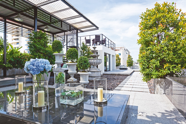 - ห้องสวนในบรรยากาศส่วนตัวเนื่องจากอยู่บนที่สูงจึงสามารถมองเห็นทัศนียภาพได้กว้างไกลขณะที่ผู้ที่ด้านล่างมองขึ้นมาไม่เห็นเราการสร้างห้องสวนสามารถทำได้ง่ายด้วยการทำกระบะปลูกต้นไม้ล้มรอบพื้นที่บริเวณที่สามารถมองเห็นวิวสวยควรปลูกพรรณไม้ระดับต่ำส่วนบริเวณที่อาจมองจากตึกที่สูงกว่าได้ควรปลูกต้นไม้ปิดล้อมเพื่อสร้างความเป็นส่วนตัวสวนแห่งนี้เลือกใช้วัสดุปลูกที่ไม่ต้องปรับเปลี่ยนบ่อยชั้นล่างของกระบะจึงวางกระถางเก่าเหลือใช้คว่ำเรียงเป็นแนวยาวตามรูปกระบะโรยหินคลุกหรือเศษอิฐหักตามช่องว่างกระถางปูแผ่นจีโอเท็กซ์ไทล์ทับเพื่อกรองชั้นเศษดินที่อาจไหลไปอุดตันท่อระบายน้ำ
