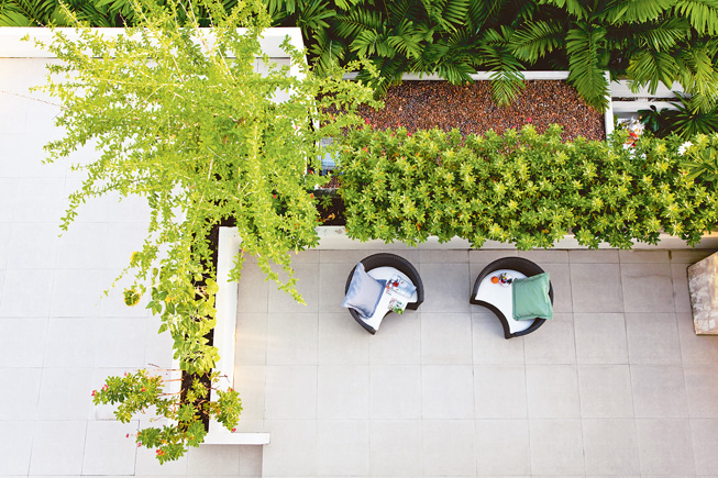 บริเวณเอ๊าต์ดอร์ออกแบบให้มีทางเดินเชื่อมต่อไปยังที่นั่งแต่ละจุดปลูกต้นไ้ในกระบะแทนผนังโดยรอบสร้างความเป็นส่วนตัวในมุมนั่เล่นคล้ายห้องนั่งเล่นในสวน