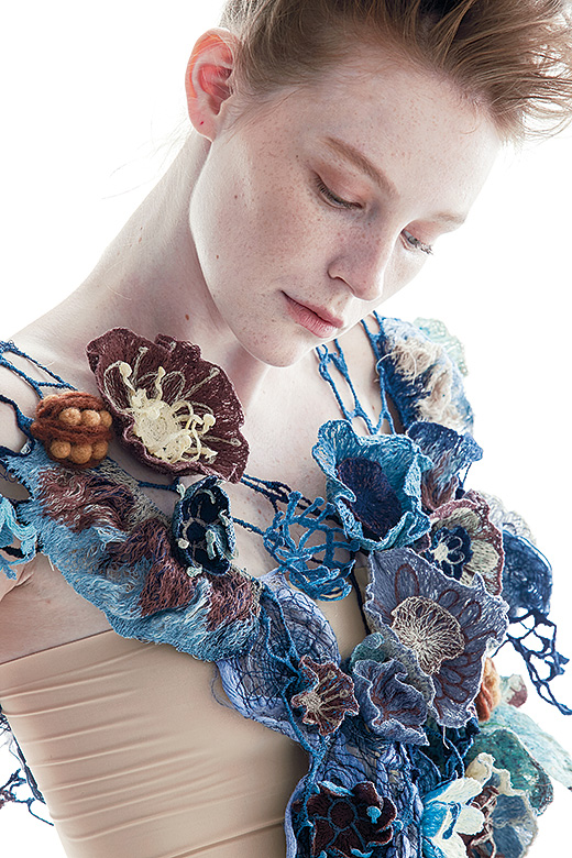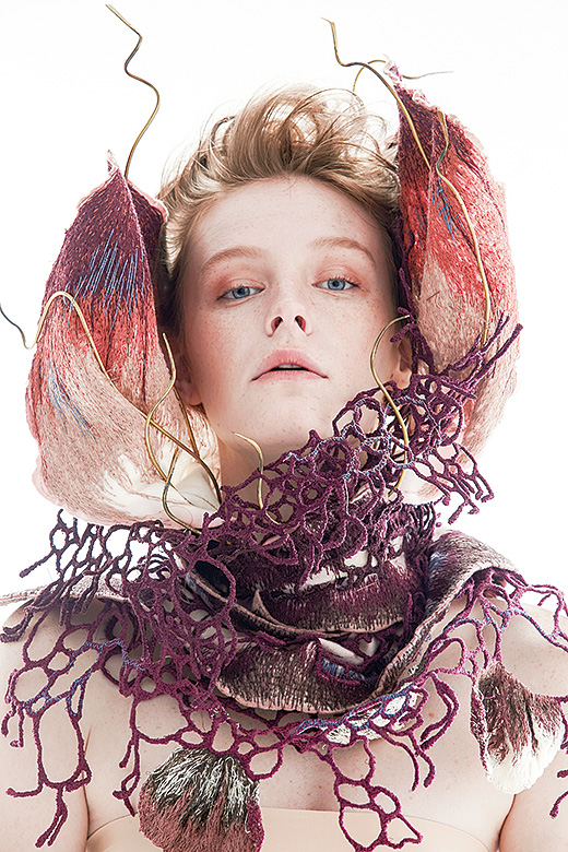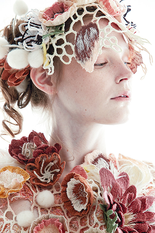 “อย่างงานวิทยานิพนธ์ของพลอยเองก็ทำเรื่องเกี่ยวกับดอกไม้ในธรรมชาติกับผู้หญิง ในคอนเซ็ปต์ของความลึกลับโรแมนติกของหญิงสาว โดยใช้การปักเย็บดอกไม้ลงบนแผ่นพลาสติกละลายน้ำ พอนำไปล้างแล้วแผ่นพลาสติกก็จะละลายออกไป เหลือแต่เส้นด้ายที่เราเย็บทับซ้อนไว้เป็นดอกไม้และส่วนต่างๆ พลอยใช้วิธีตากแห้งไปกับโครงรูปทรงที่ต้องการเหมือนเป็นการดัดรูปทรงตามธรรมชาติ แล้วหาเทคนิคการนำดอกไม้เหล่านั้นลงมาประดับเป็นชุดคลุมร่างกาย เย็บประกอบเป็นรูปเป็นร่างขึ้นมา”