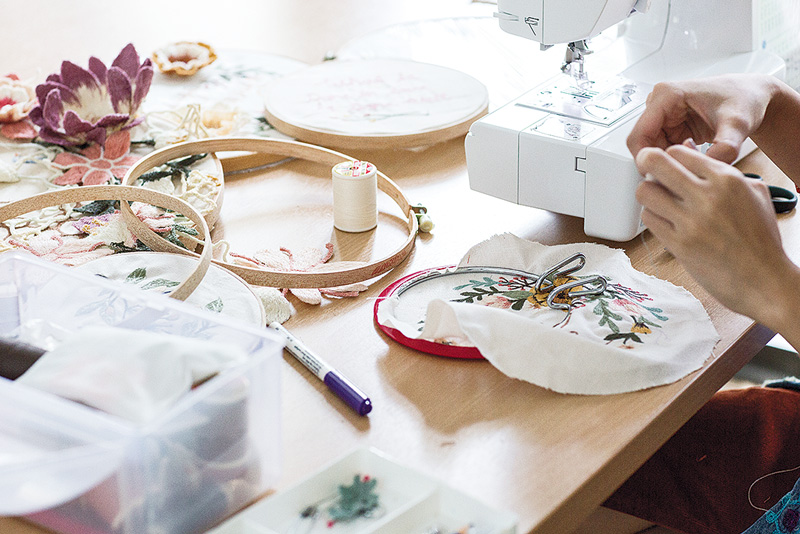 “ขั้นตอนการทำงานของพลอยเริ่มจากใช้ปากกาเขียนผ้าร่างรูปแบบดอกไม้ที่ต้องการลงบนผ้าแคนวาสหรือผ้าที่มีความหนาสักหน่อย เพราะถ้าใช้ผ้าที่มีความบางเกินไป เวลาเย็บถี่ๆ แล้วเนื้อผ้าอาจย่นยับดูไม่สวย พอได้โครงร่างในองค์ประกอบที่สวยงามแล้ว ก็มาคิดเรื่องสี โดยเลือกสีด้ายต่างๆ แล้วเย็บปักลงไปตามโครงร่างดอกไม้ ถ้าเป็นเมื่อก่อนพลอยนั่งปักมือก็ค่อนข้างใช้เวลามากหน่อย แต่พอมีจักรแล้วช่วยทำให้การผลิตงานเร็วขึ้น และทำเทคนิคได้หลากหลายมากขึ้นด้วย ดูได้จากเส้นด้ายที่ทับซ้อนอย่างละเอียดมากกว่างานปักมือ ถ้าใช้จักรก็สามารถทำงานชิ้นหนึ่งให้เสร็จได้ภายใน 40 นาที โดยชิ้นงานพวกนี้สามารถนำไปใช้เป็นของตกแต่งผนัง ไปเป็นลวดลายบนผ้าม่าน หมอนอิง ผ้าปูโต๊ะ ผ้าคลุมเตียง หรือแม้แต่เสื้อผ้าก็ได้ค่ะ