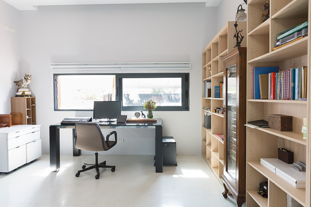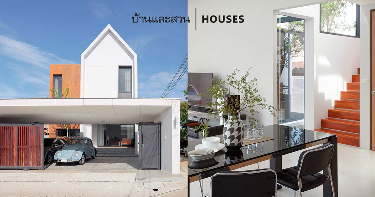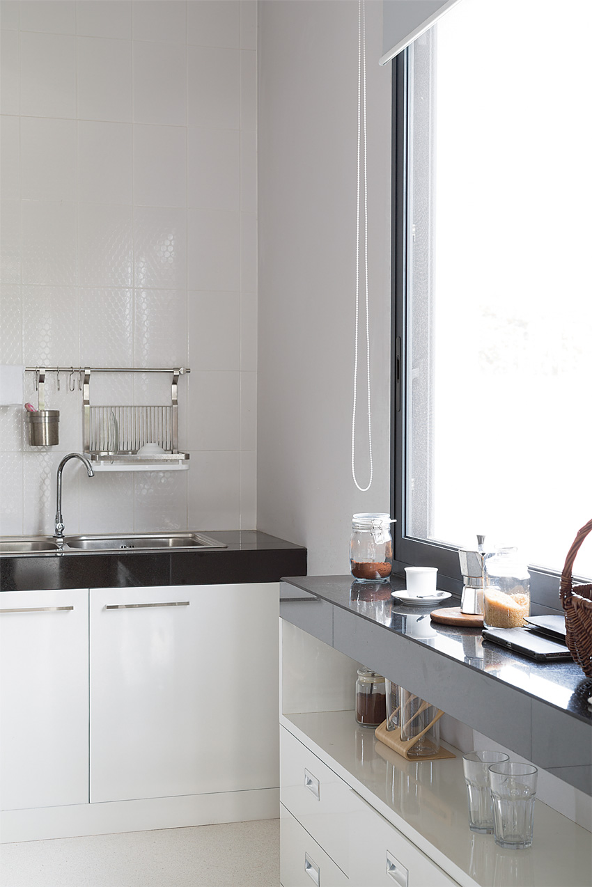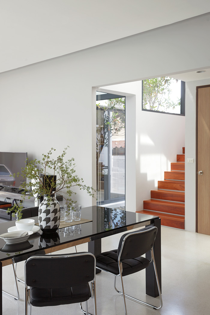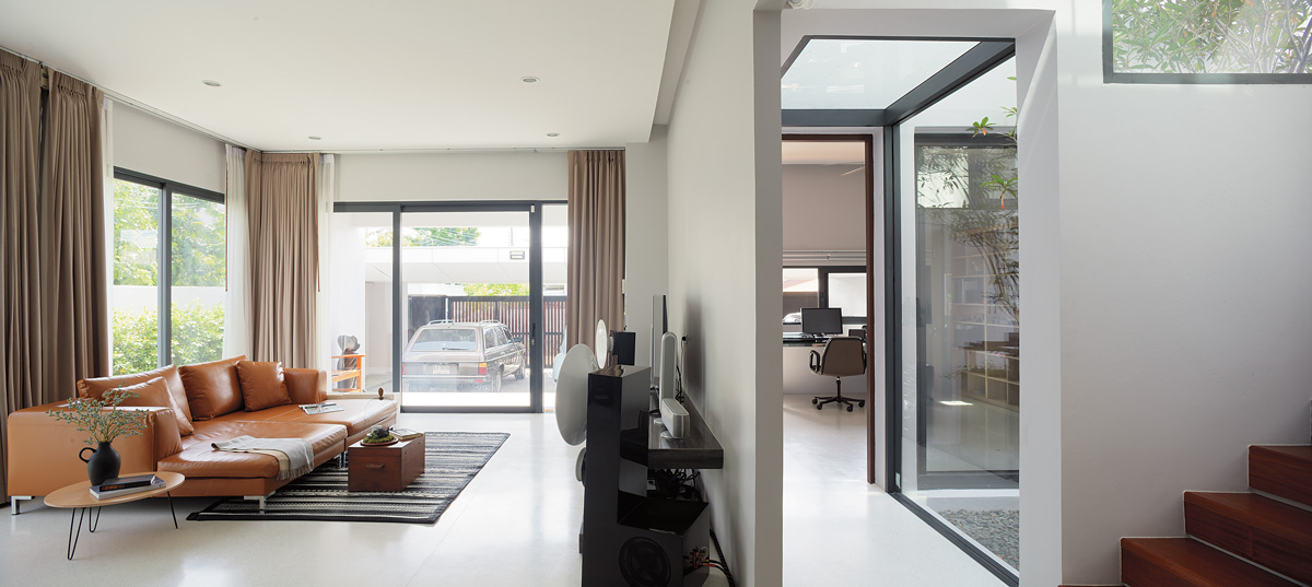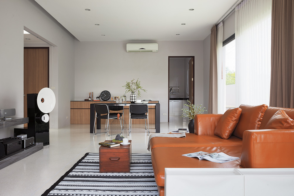 การออกแบบภายในอย่างเรียบง่ายที่เน้นสีขาวตัดสลับกับกรอบบานสีเข้ม ทำให้ตัวบ้านเหมือนภาพเรขาคณิต ตัดสลับกับสีเอิร์ธโทนของไม้ โซฟาหนัง และผ้าม่านสีน้ำตาลอ่อน ช่วยเบรกให้บ้านดูอบอุ่นขึ้น ไม่เฉียบคมจนเกินไป แต่ละพื้นที่ซึ่งดูคล้ายห้องสี่เหลี่ยมเชื่อมต่อเข้าหากันด้วยจังหวะที่พอดิบพอดีจนกลายเป็นพื้นที่ต่อเนื่องกันไปตลอดทั้งหลัง