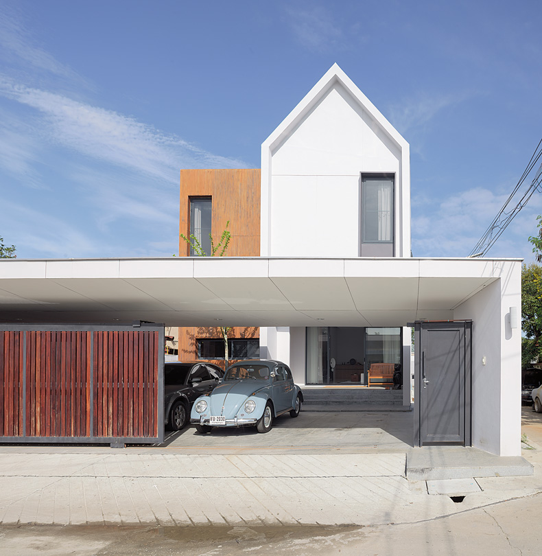 บางสิ่งในบ้านหลังนี้อาจดูเหมือนบ้านสไตล์โมเดิร์นอย่างที่ในยุคสมัยนี้นิยม แต่แท้จริงแล้วยังมีการออกแบบที่ไม่ผิดแผกไปจากยุคของคุณพ่อคุณแม่เช่นเดียวกัน ไม่ว่าจะเป็นจั่วของหลังคาบ้านที่เลือกมาแทนหลังคาแบน เพราะต้องการให้ดูคล้ายบ้านเดิม หรือการปรับจังหวะของสวนที่เชื่อมโยงเข้ามาในบ้านให้เกิดเป็นช่วงหลังคากระจก รวมถึงการแบ่งพื้นที่เปิดให้หลังคาที่จอดรถ เพื่อให้แสงแดดส่องเข้ามายังประตูหน้าบ้านได้ สิ่งเหล่านี้อาจเป็นคติบางอย่างจากหลักการทางวัฒนธรรม แต่ที่แน่ๆคือบ้านหลังนี้ตั้งอยู่ตรงกลางระหว่างความประนีประนอมของคุณพ่อคุณแม่กับคุณกิ๊กเอง ด้วยเหตุนี้กระมังที่ทำให้เรารู้สึกได้ถึงความอบอุ่นภายในบ้านที่มีจังหวะ ธรรมชาติ และความลงตัว “พอดี” ในแบบของตัวเอง