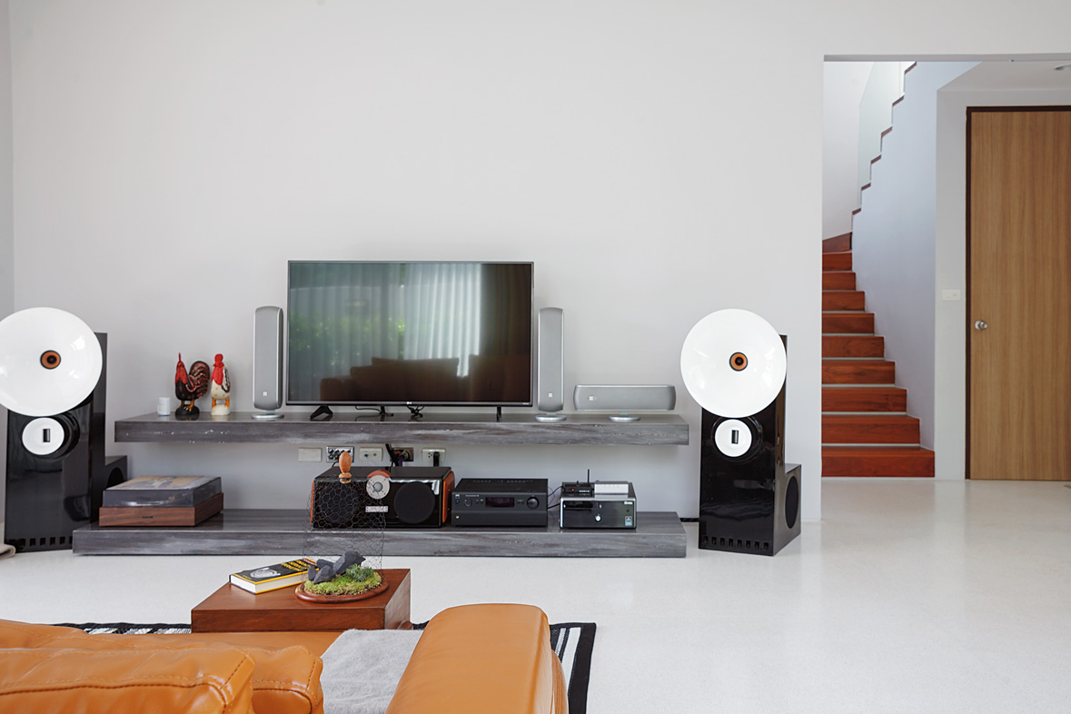 นอกจากความโมเดิร์นของบ้านหลังนี้แล้ว ของเก่าที่คุณพ่อคุณกิ๊กสะสมไว้ก็มีอิทธิพลต่อการเลือกวัสดุในบ้านอยู่พอสมควร “ผมชอบพื้นหินขัด แม้จะไม่ใช่วัสดุหรูหรา แต่ก็ให้ความรู้สึกคล้ายบ้านสมัยก่อน ที่สำคัญคือผมชอบที่พื้นผิวเรียบเนียนต่อเนื่องกันไปตลอด ต้องการการดูแลน้อยกว่าพื้นไม้ และดูสะอาดกว่าพื้นปูนขัด” ซึ่งพื้นหินขัดนี้เองที่เชื่อมโยงความโมเดิร์นกับของตกแต่งที่เป็นของเก่าได้อย่างดี