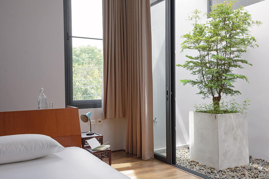 ธรรมชาติที่สัมผัสได้ด้วยสายตาเป็นวิธีการแยบยลที่ทำให้บ้านหลังนี้ดูสดชื่นขึ้นอย่างไม่น่าเชื่อ ทุกพื้นที่ของบ้านจะมองเห็นธรรมชาติได้ตลอดเวลา ไม่ว่าจะเป็นเงาต้นไม้ที่สะท้อนตามกระจก หรือแสงที่ส่องกระทบพื้นกรวดและสะท้อนเข้ามาภายในตัวบ้านผ่านช่องในระดับพื้น แม้จะเป็นจังหวะเล็กๆ แต่จังหวะของการเปิดและปิดในช่วงต่างๆของเส้นสายและธรรมชาติ ทำให้ทั้งสองสิ่งเติมเต็มกันและกันได้ดี อีกทั้งแสงในแต่ละช่วงเวลาของวันยังสามารถสาดส่องเข้ามาในบ้านได้ เช่น แสงที่สาดเข้ามาตามช่องกระจกที่พื้นชั้นสองในยามเช้า บ่งบอกการมาถึงของแสงอาทิตย์ หรือเงาไม้บนผนังทิศตะวันตกในยามเย็นที่ฉาบผนังให้เป็นสีส้ม ทำให้ผู้อยู่ภายในบ้านรับรู้ความเป็นไปของโลกและธรรมชาติได้ดียิ่งขึ้น