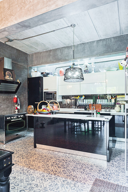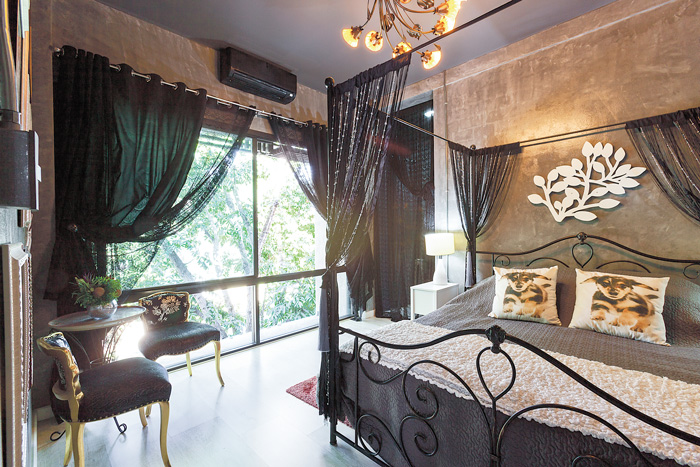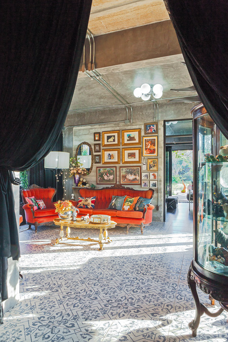 เราได้เห็นความกล้าในการผสมผสานของคุณกุ๊กอยู่ทุกมุมของบ้าน เริ่มจากทางเข้าที่ประดับด้วยกลุ่มกระจกเงาโบราณในกรอบหลุยส์สีทอง ขนานไปกับตู้ไม้เก่าบนทางเดินที่ปูพื้นกระเบื้องโบราณ ผ่านผ้าม่านสีดำผืนใหญ่ราวกับกำลังเปิดเข้าไปสู่โรงละครส่วนตัว ซึ่งต้อนรับเราด้วยชุดโซฟาหลุยส์ที่ซื้อมาจากปารีส เพราะหาโซฟาที่ถูกใจในเมืองไทยไม่ได้เลย จนกระทั่งไปพบที่ตลาดเก่าของปารีส มาพร้อมกับโต๊ะกลางซึ่งเป็นหินอ่อน โดยคุณกุ๊กนำหมอนอิงรูปสุนัขไปวางผสมผสาน ส่วนผนังด้านหลังห้องประดับด้วยรูปสุนัขในกรอบไม้สไตล์โมเดิร์น แถมใกล้ๆ กันยังมีตู้กระจกโบราณเก็บตุ๊กตาตัวตลกและของที่ระลึกจากโรงละครต่างๆ