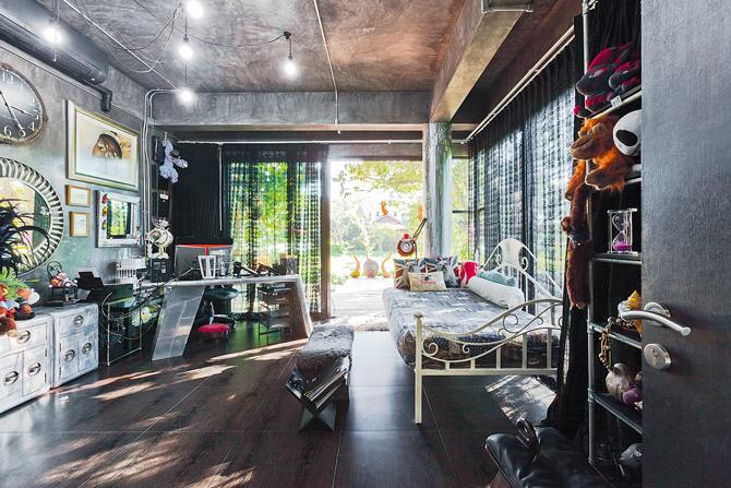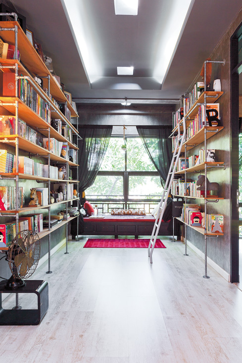ฟังก์ชันของชั้นบนยังมีมุมอ่านหนังสือที่คุณกุ๊กใช้ท่อประปามาต่อกับชั้นไม้สำหรับวางหนังสือที่รักและเก็บสะสมไว้มากมาย “ผมได้ไอเดียนี้มาจากตอนไปเที่ยวนิวยอร์กและเห็นร้านขายกางเกงยีนตกแต่งด้วยท่อประปาแบบนี้ เลยนำมาปรับใช้เป็นชั้นหนังสือที่บ้านดู แล้วมุมนี้มองออกไปเห็นต้นไม้ใหญ่ด้านนอกได้ ก็เลยตั้งเดย์เบดสำหรับนอนเล่นอ่านหนังสือไว้ด้วย”