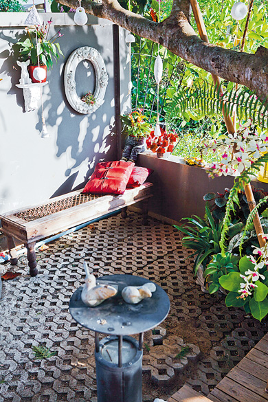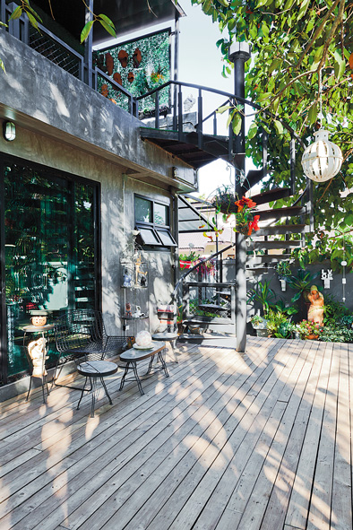 เมื่อแต่งไปจนแทบครบทุกมุมแล้ว คุณกุ๊กบอกว่าเกือบลืมโฮมเธียเตอร์ จึงต้องทำห้องฝังไปบนพื้นที่ระเบียงเชื่อมต่อจากตัวบ้าน แล้วใช้ผ้ากำมะหยี่สีดำปิดกั้นแสงและลดการสะท้อนของแสงไว้ทั่วห้องคล้ายกระโจมแบบโมร็อกโก เมื่อยังเหลือพื้นที่ระเบียงด้านนอกอีกหน่อย จึงจัดเป็นมุมนั่งเล่นรับลม โดยปูพื้นหญ้าเทียมต่อเนื่องไปถึงผนัง กลายเป็นมุมเขียวที่เชื่อมต่อไปสู่สวนรอบบ้านได้เลย